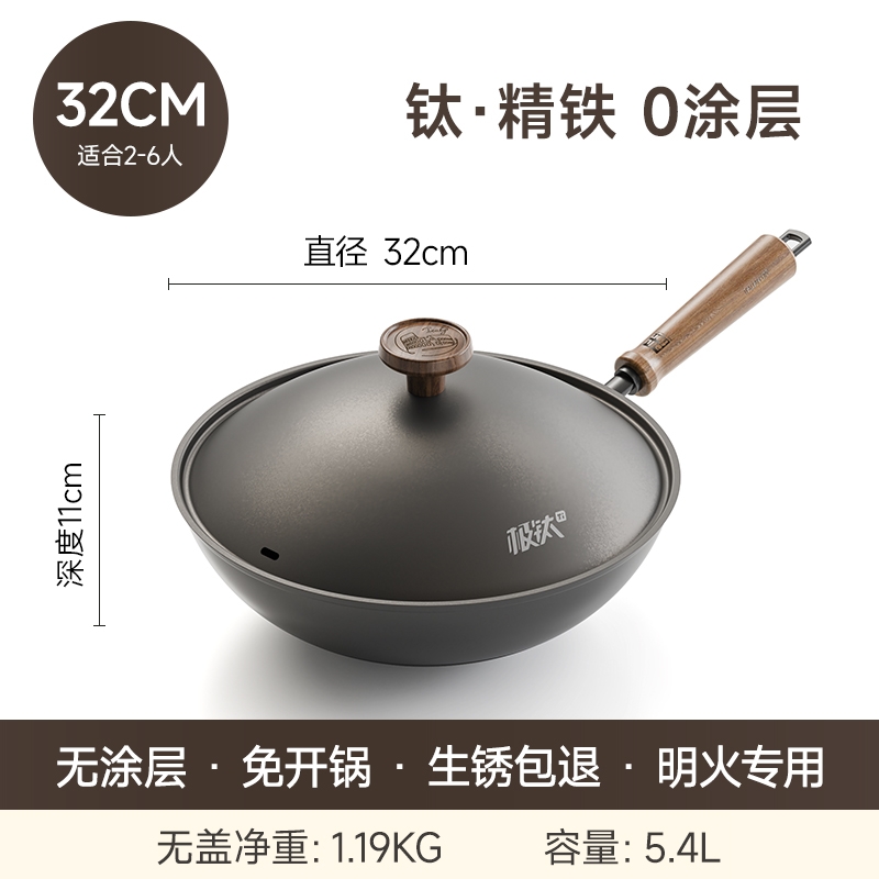 等离子钛熔覆,0”涂层,国标1级不粘;精选优质钢材,含铁量达到99.6%,;高温室化液氨工艺不生锈;专属晶螺锅底,防滑耐磨;高拱铁盖设计,蒸汽回流,保温锁鲜