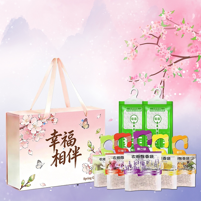 配置清单:衣柜飘香袋五包5个香味各一包柜除湿袋2袋、精美彩盒1个。