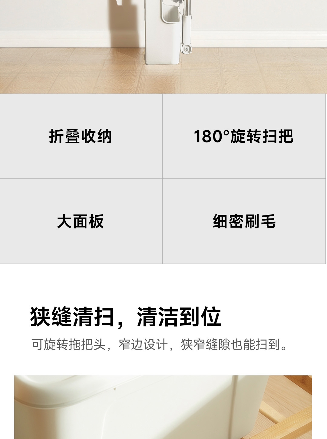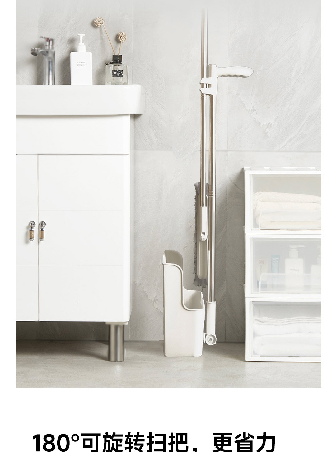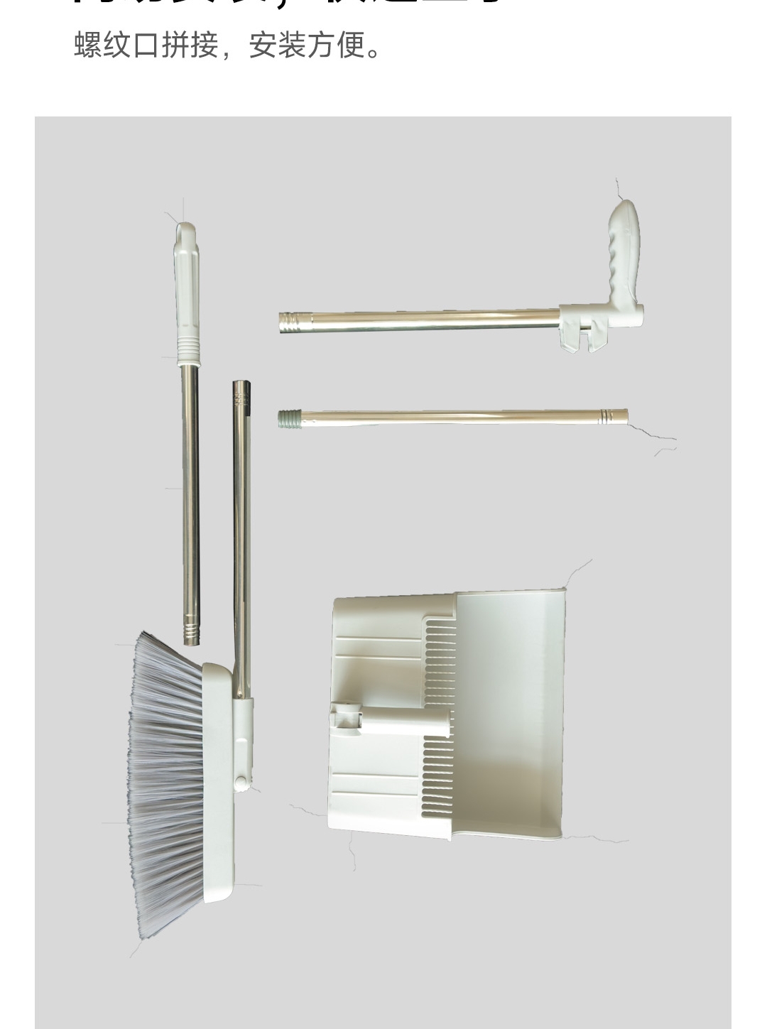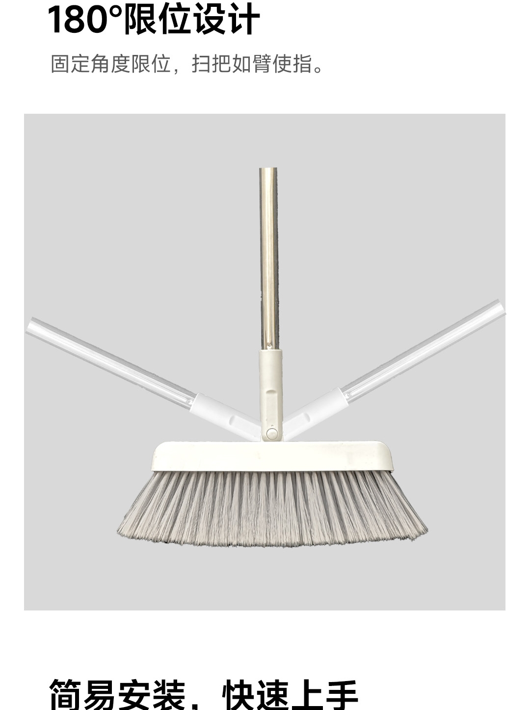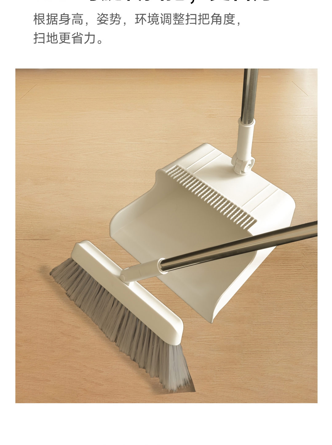 可折叠收纳,更省空间;180°旋转扫帚,31cm大面板,簸箕多梳齿;加厚不锈钢杆子,紧固耐用,不会生锈