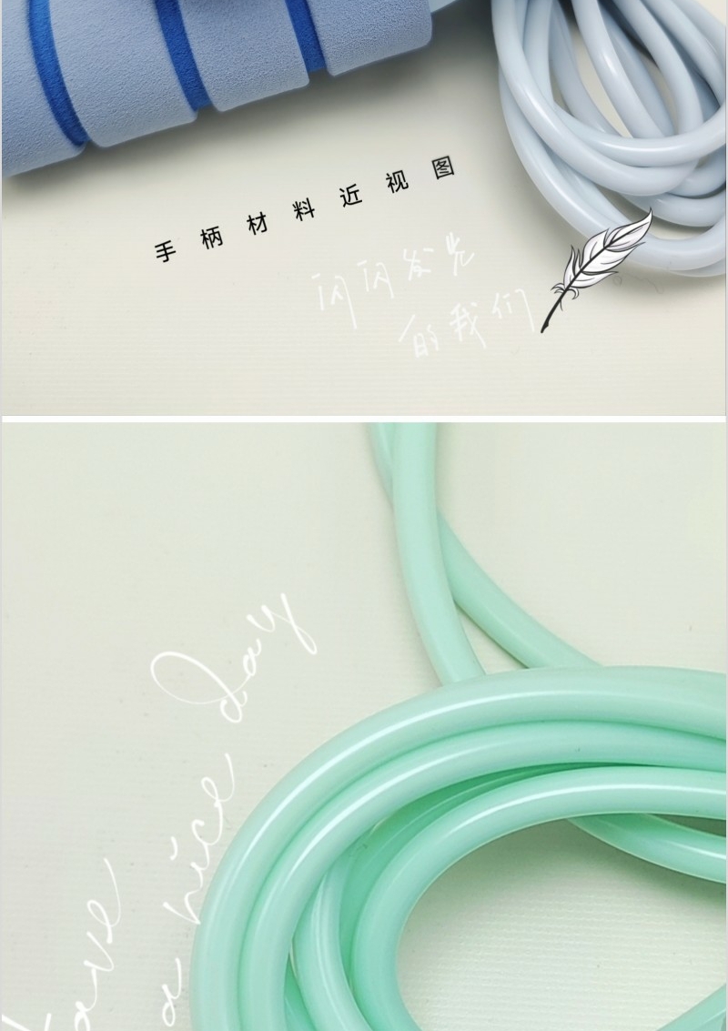 炫彩跳绳:颜色随机 手柄尺寸:140*33mm 跳绳总长:约2.8米 产品净重:115克 产品材质:PP/PVC