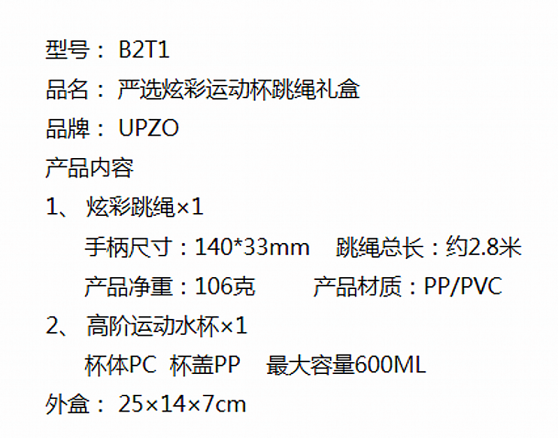 配置清单:炫彩跳绳*1 炫彩运动水杯*1 礼盒*1