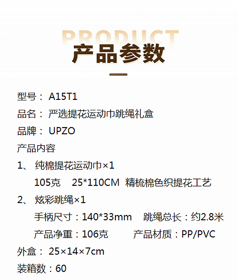 配置清单:纯棉运动巾*1 炫彩跳绳*1 礼盒*1
