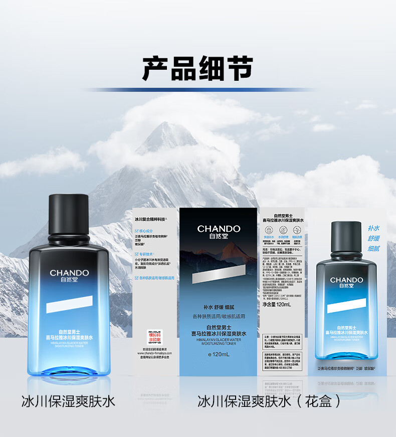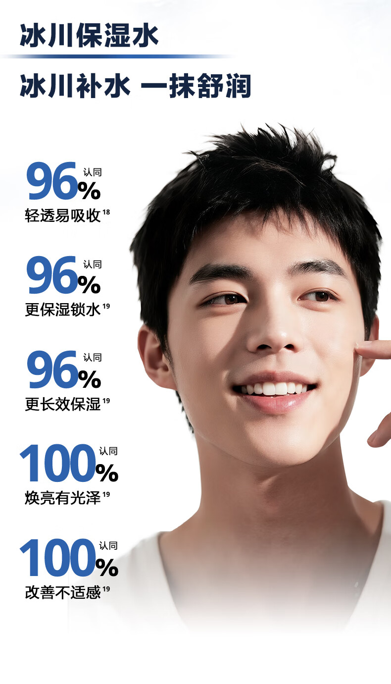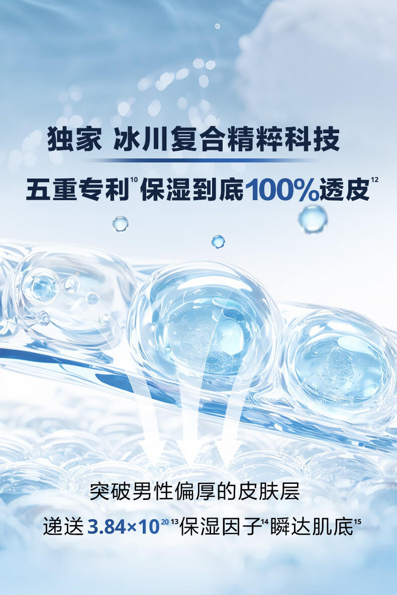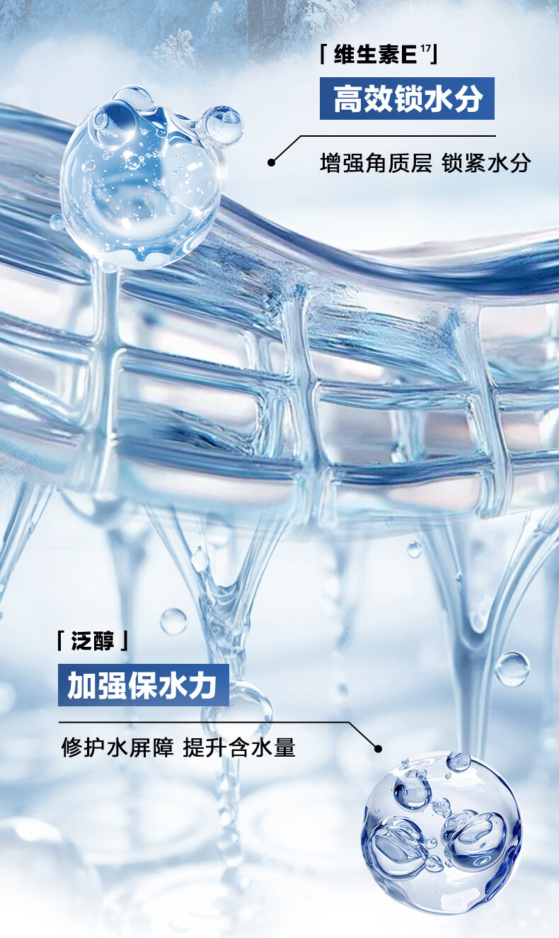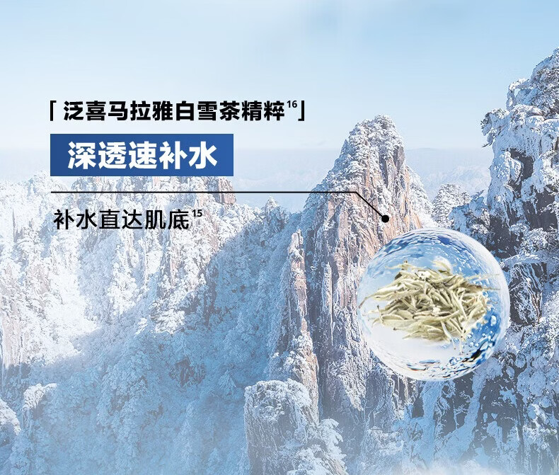 深透速补水,水润清爽;冰川复合精粹科技;泛喜马拉雅白雪茶精粹、玻尿酸、泛醇