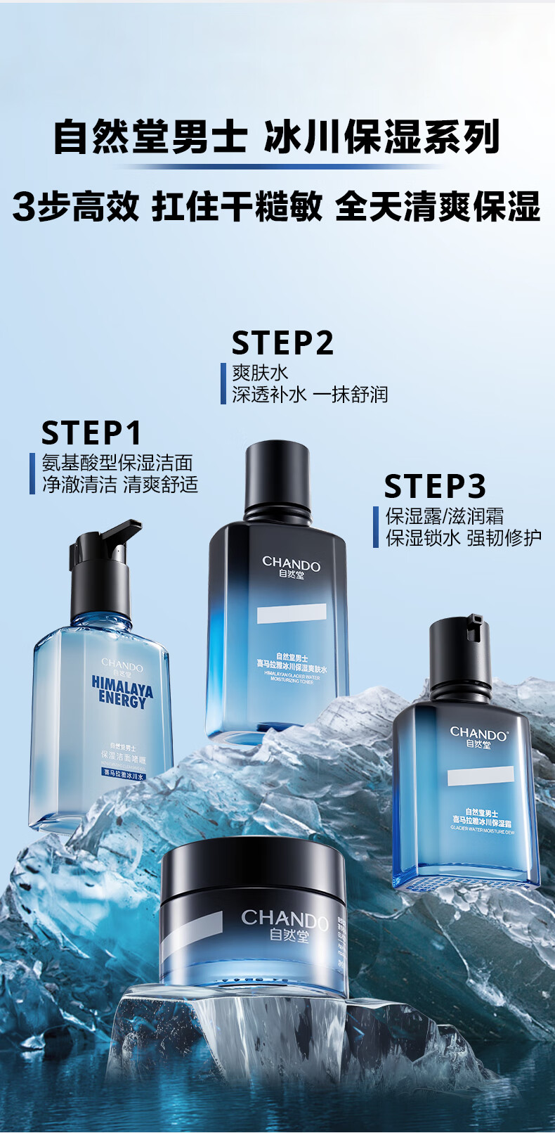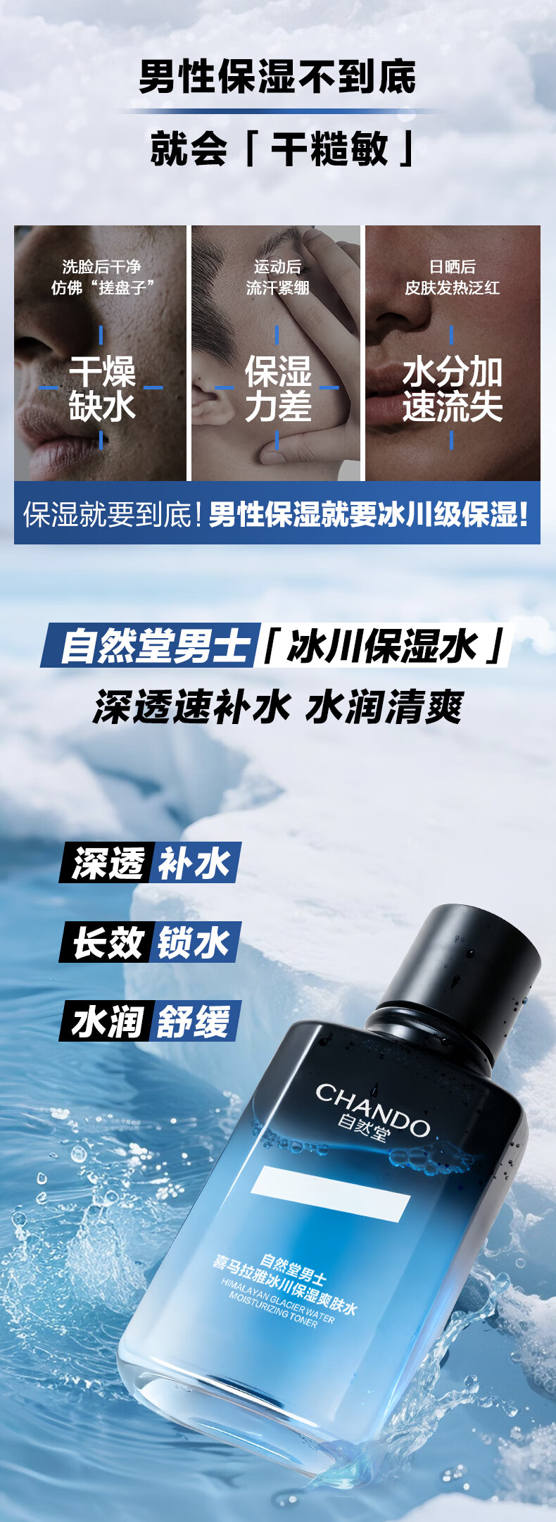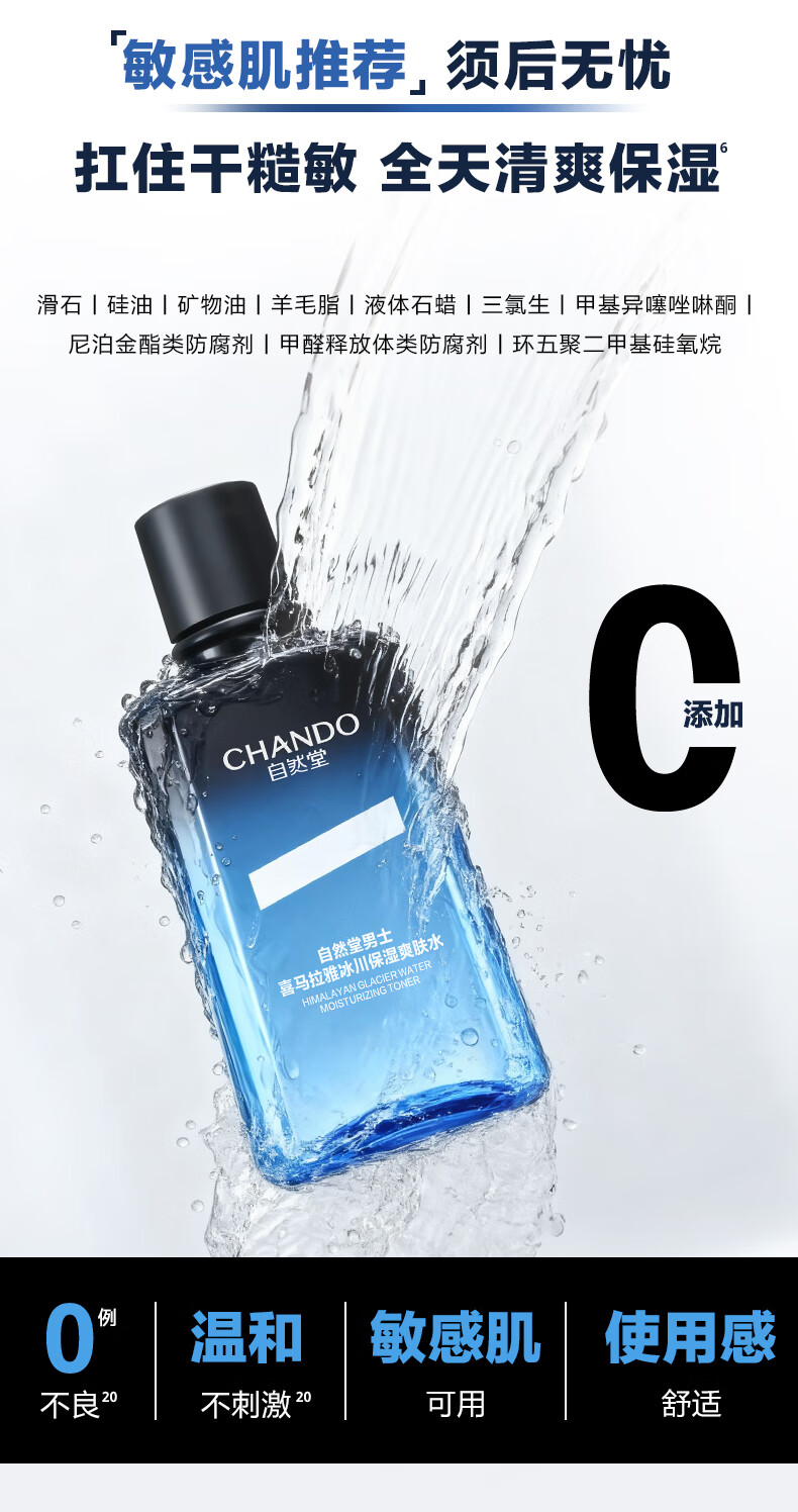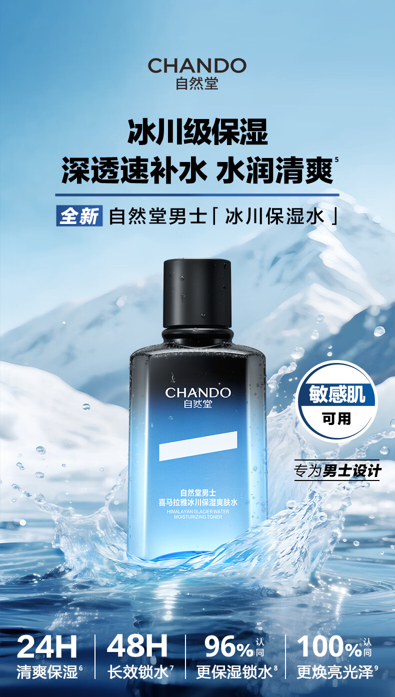 深透速补水,水润清爽;冰川复合精粹科技;泛喜马拉雅白雪茶精粹、玻尿酸、泛醇