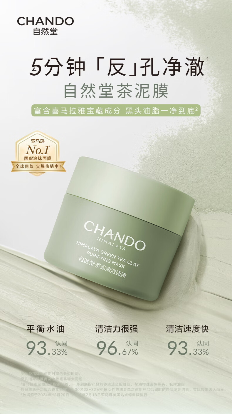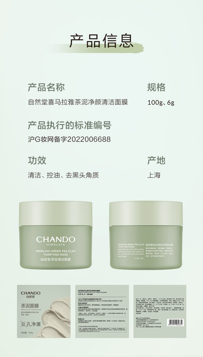 去黑头、去角质,8小时控油(绿泥 茶粉 冻干茶萃 ;5分钟 彻底清洁(聚合物配方体系 清洁焕新);拒绝刺激拔干(温和配方 不含防腐 香精 酒精)