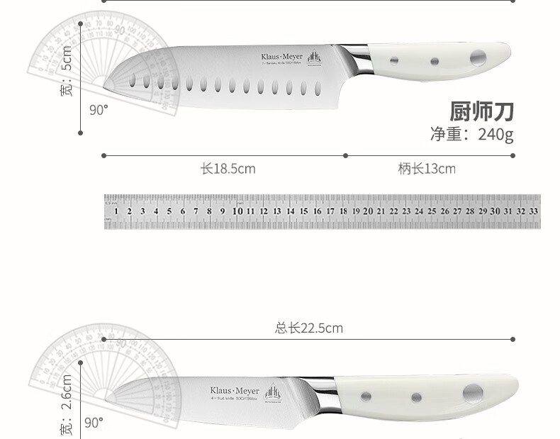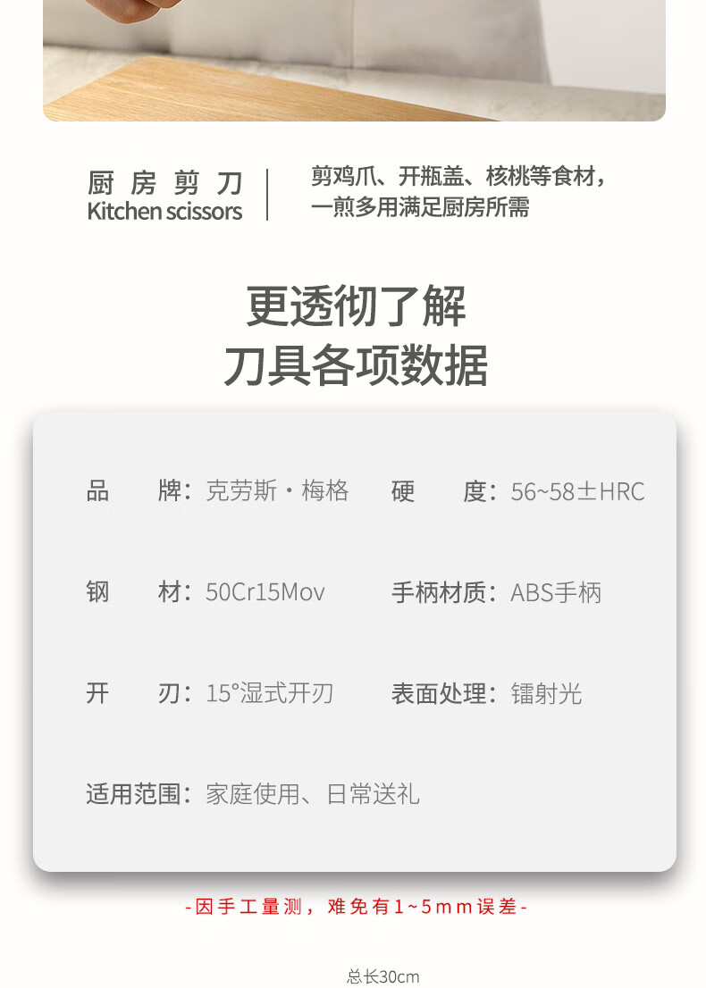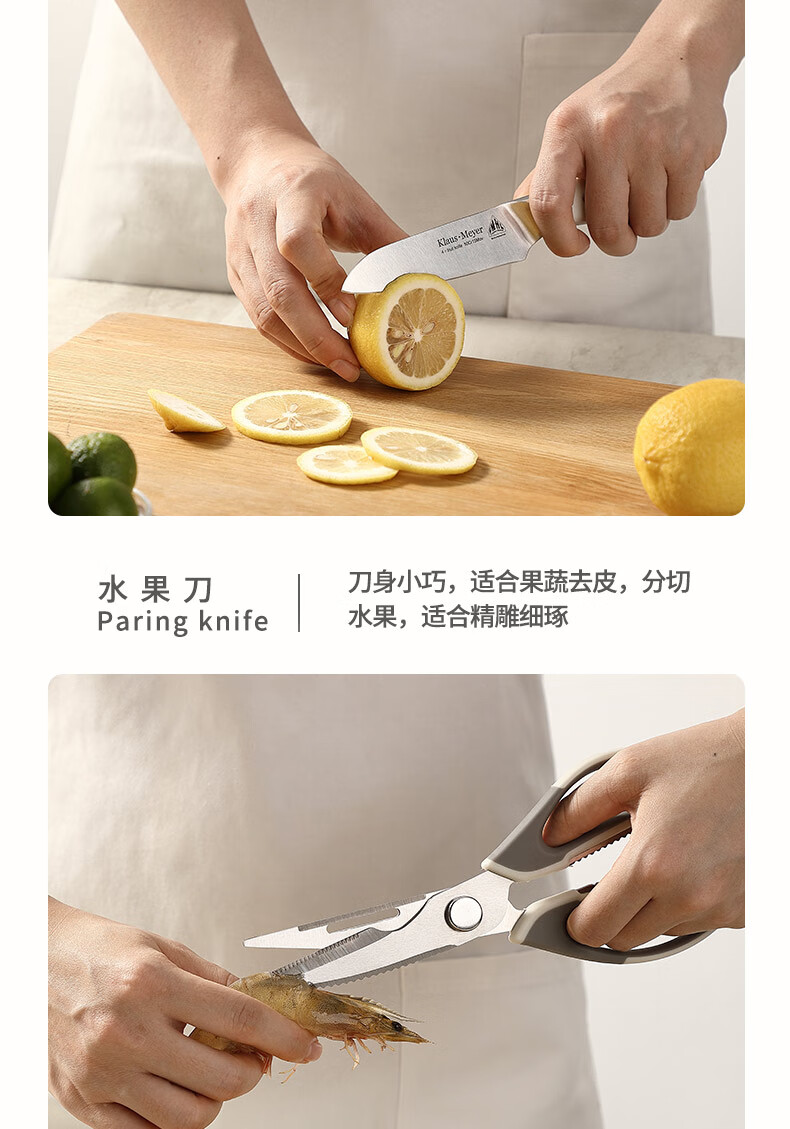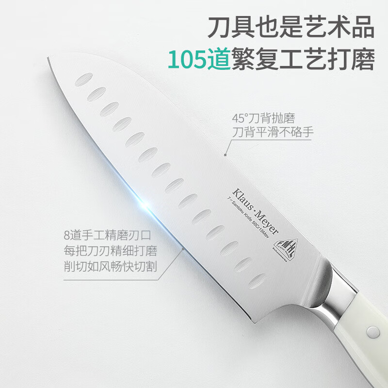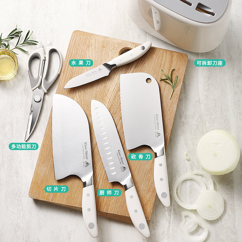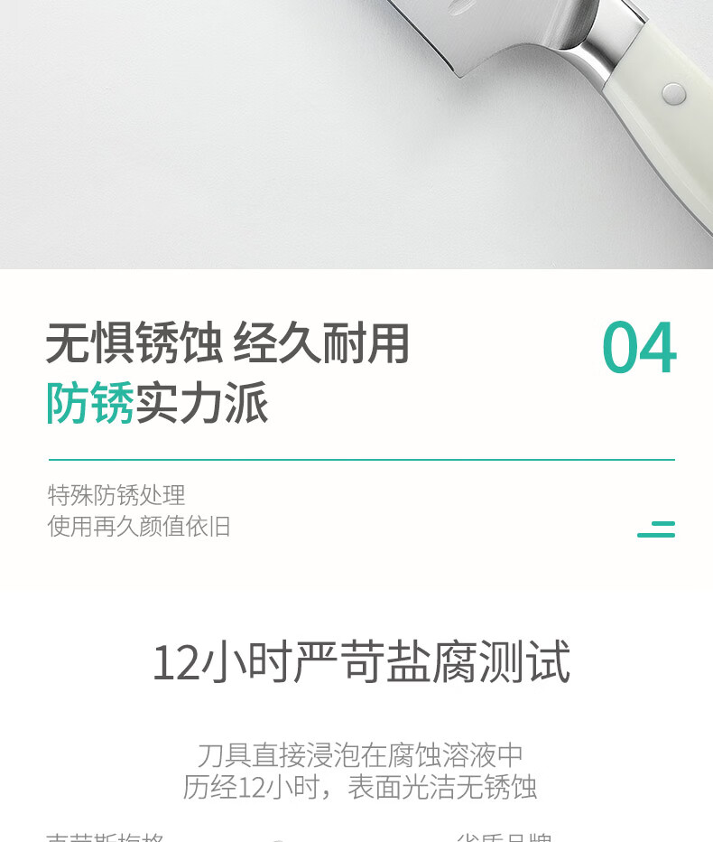 精选优质5CR15MOV不锈钢材;高质感设计款,自然融入家局美学;湿式15°V型开刃,刀具更快、更准、更省力;从材料到成品,经过105道工艺打磨;特殊防锈处理,无惧锈蚀,经久耐用