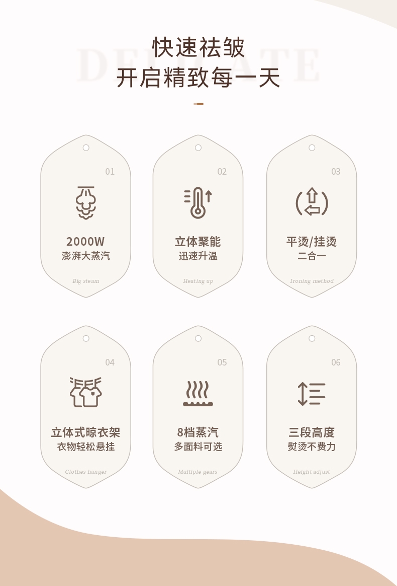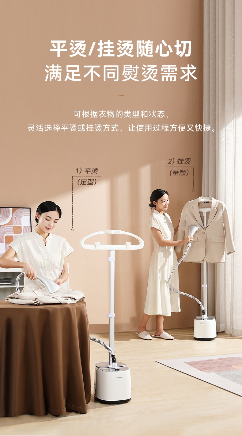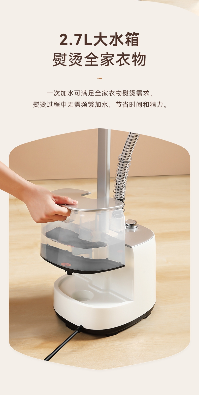 2000W大蒸汽,强劲穿透,快速除皱重塑衣形;平烫/挂烫搭配8档蒸汽,轻松熨烫各种衣物;预热快无需久等、多孔蒸汽,细腻不伤衣;2.7L大水箱避免频繁加水,熨衣时刻在线