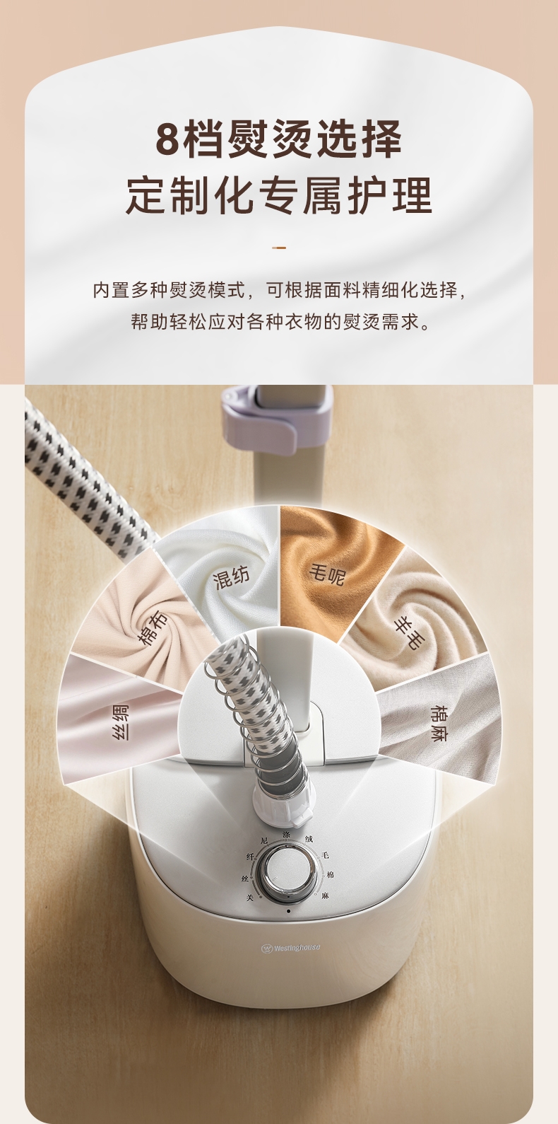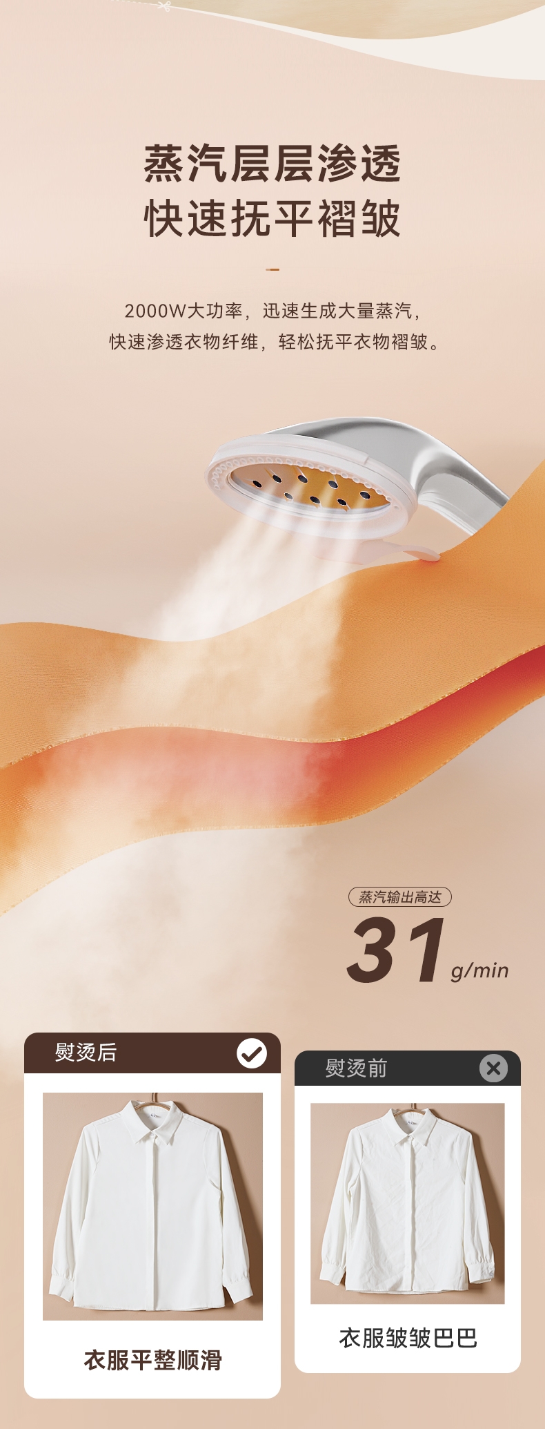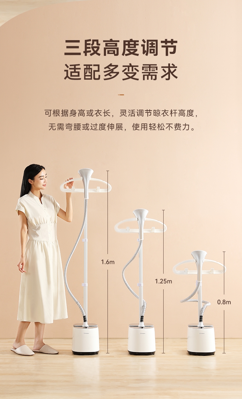 2000W大蒸汽,强劲穿透,快速除皱重塑衣形;平烫/挂烫搭配8档蒸汽,轻松熨烫各种衣物;预热快无需久等、多孔蒸汽,细腻不伤衣;2.7L大水箱避免频繁加水,熨衣时刻在线