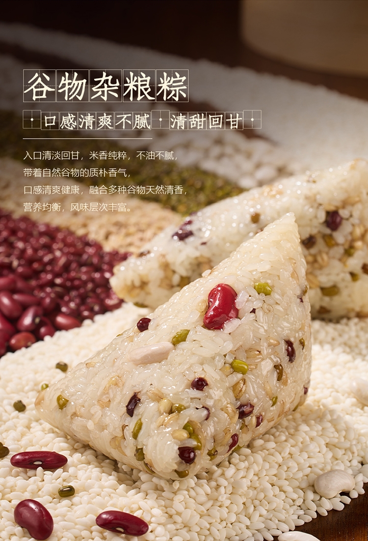 配置:鲜肉粽 140g *1 谷物杂粮粽 140g *1 红枣粽 140g *1 蜜枣桂花粽 140g *1 飘香碱水粽 140g *2