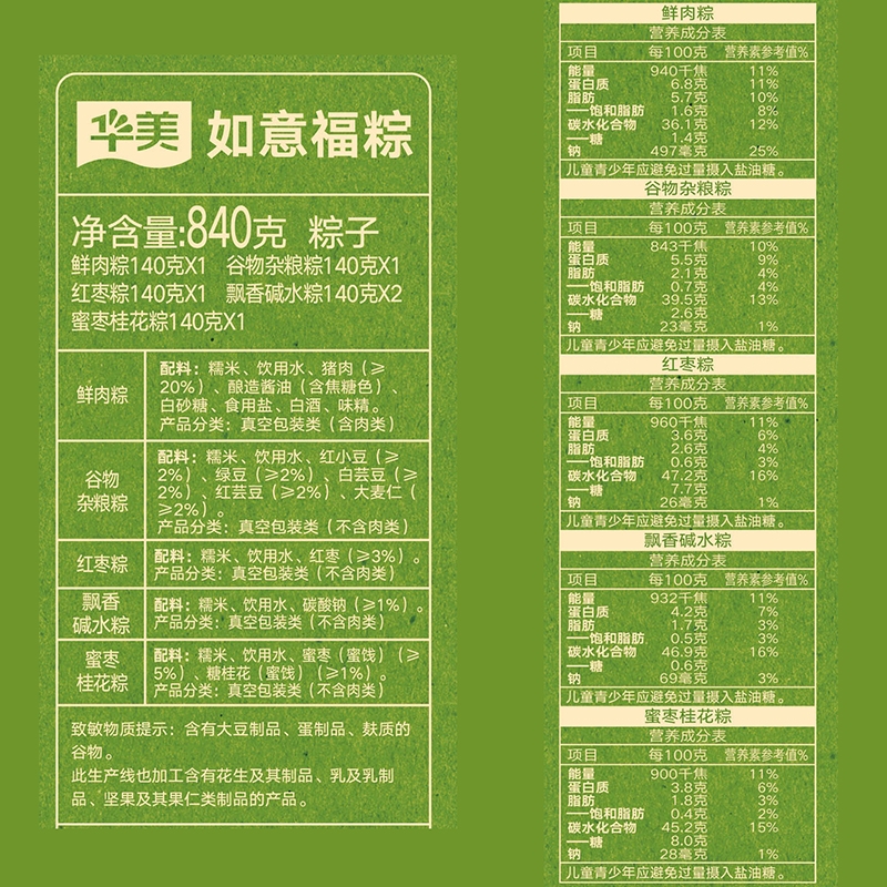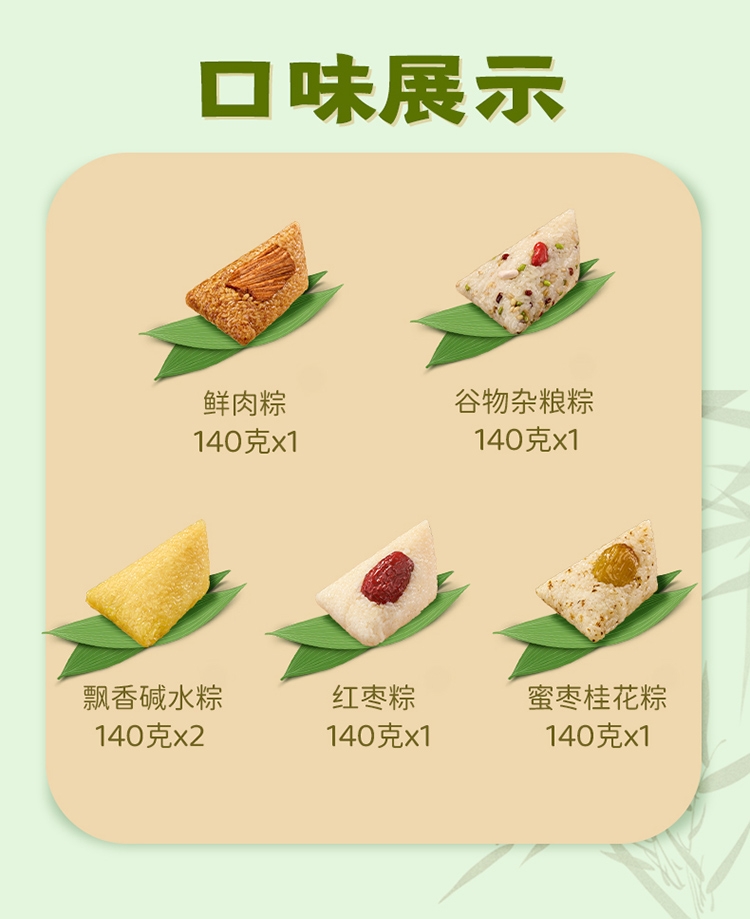 配置清单:鲜肉粽 140g *1 谷物杂粮粽 140g *1 红枣粽 140g *1 蜜枣桂花粽 140g *1 飘香碱水粽 140g *2