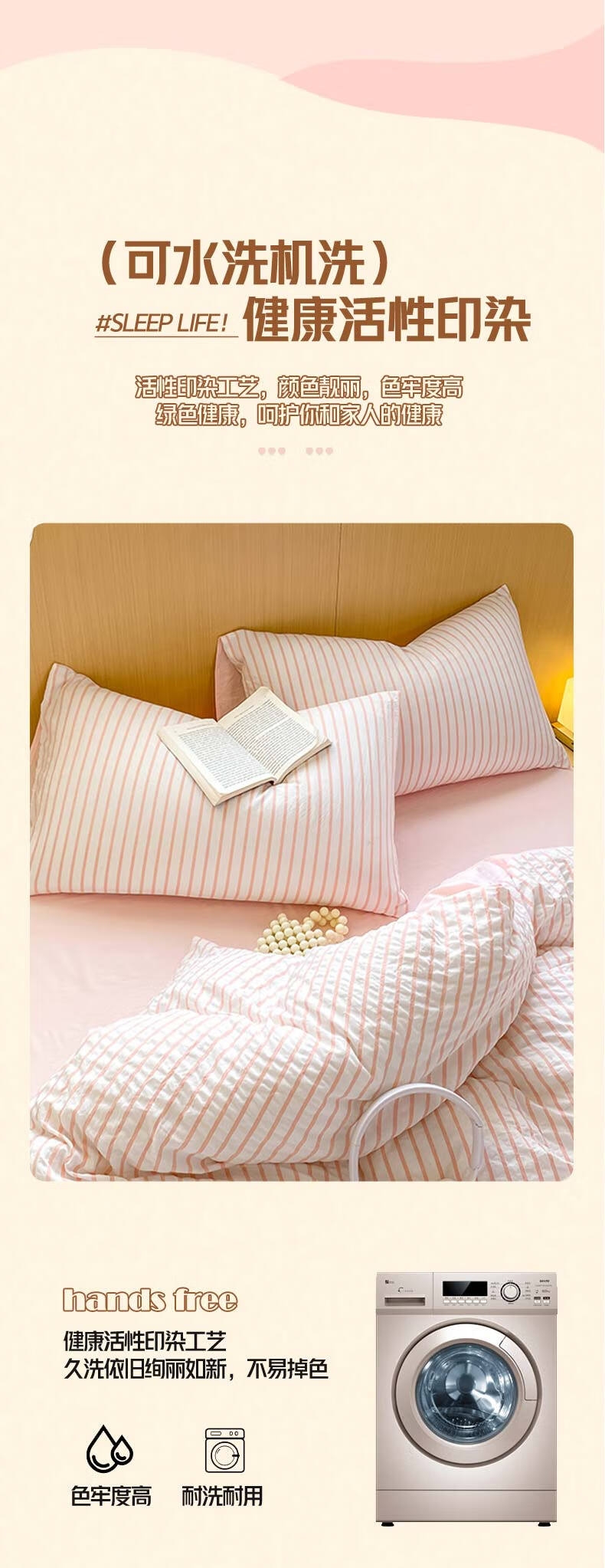 甄选亲肤水洗棉面料,云般柔软,透气舒适;母婴级A类标准,5A抗菌,抑制多种细菌的滋生;采用新一代活性印染工艺,颜色靓丽,不易起球