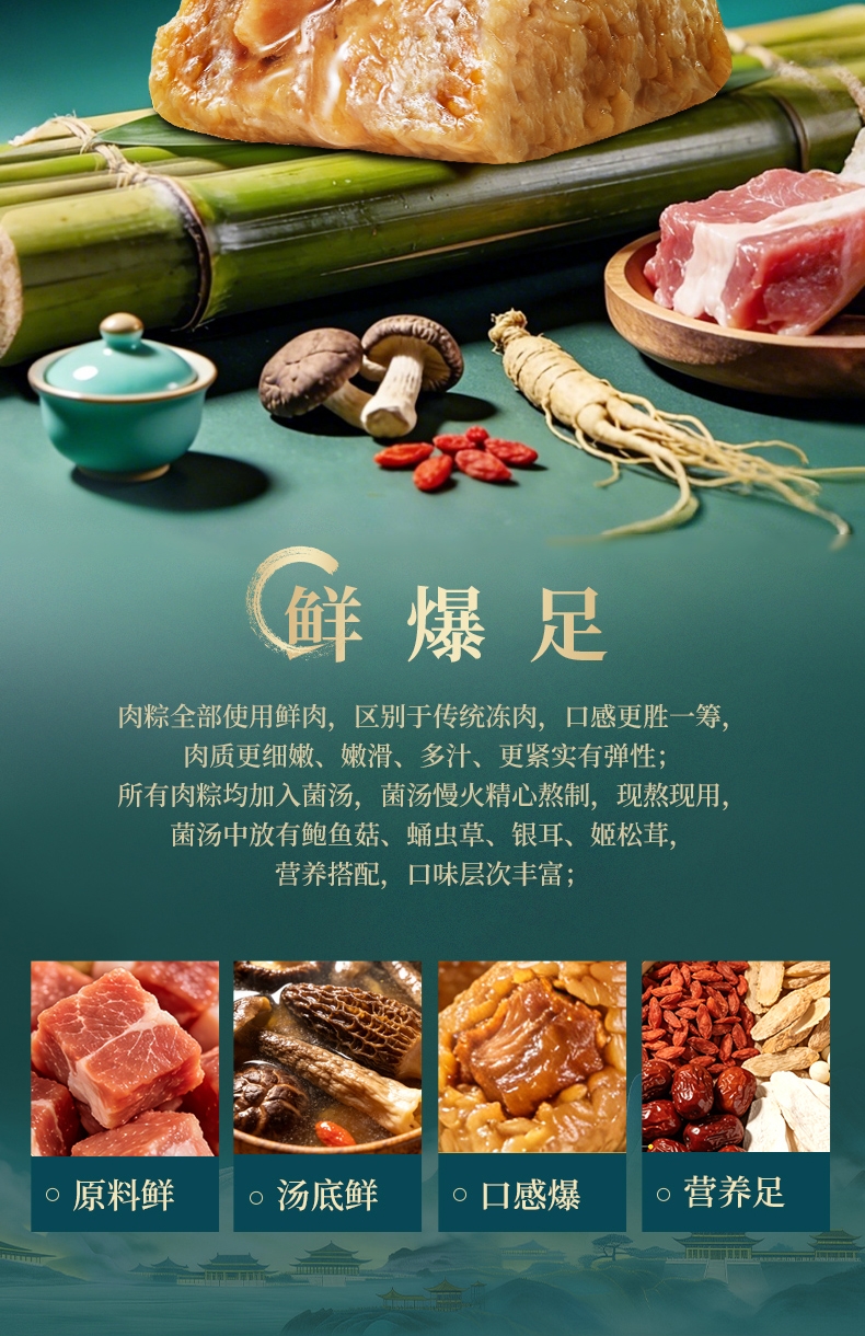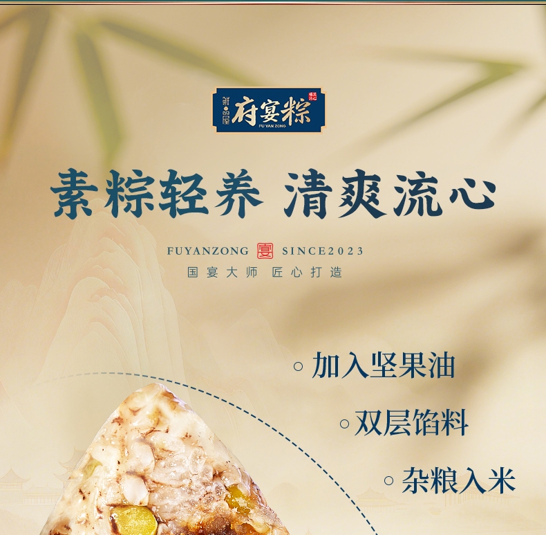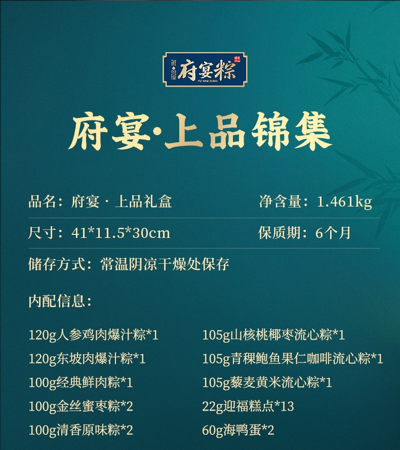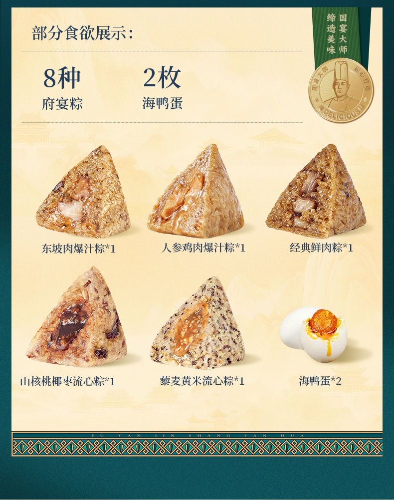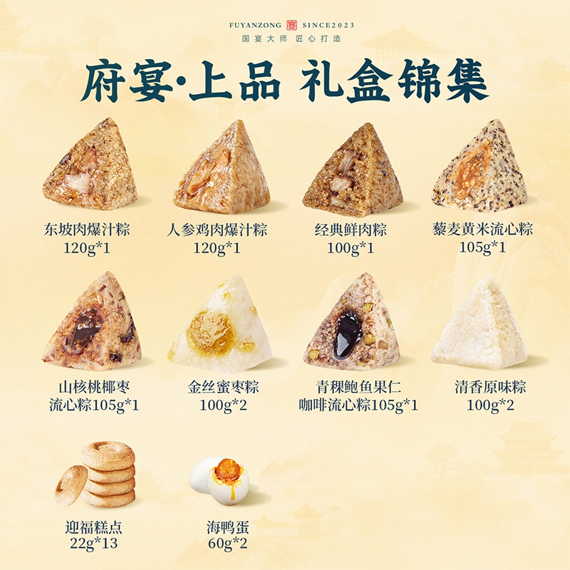 配置清单:1、鲜品屋-120g人参鸡肉爆汁粽*1 2、鲜品屋-120g东坡肉爆汁粽*1 3、鲜品屋-100g经典鲜肉粽*1 4、鲜品屋-100g金丝蜜枣粽*2 5、鲜品屋-100g清香原味粽*2 6、鲜品屋-105g山核桃椰枣流心粽*1 7、鲜品屋-105g青稞鲍鱼果仁咖啡流心粽*1 8、鲜品屋-105g藜麦黄米流心粽*1 9、鲜品屋-22g迎福糕点*13 10、鲜品屋-60g海鸭蛋*2