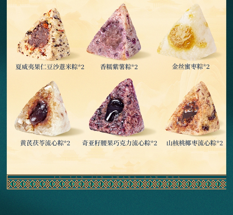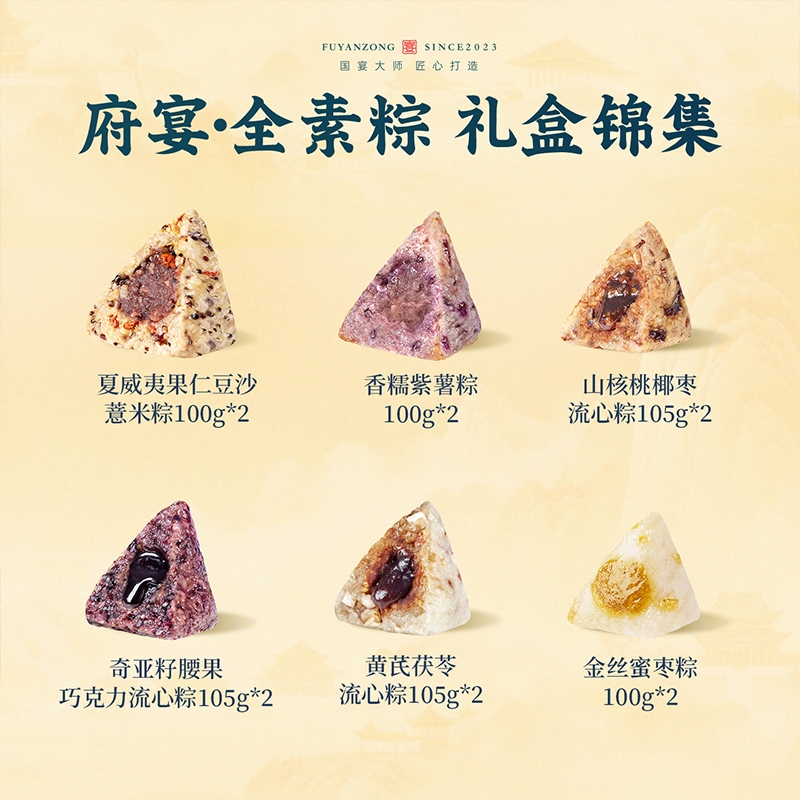 配置清单:1、鲜品屋-105g椰蓉腰果巧克力流心粽*1 2、鲜品屋-105g榛仁酱香拿铁流心粽*1 3、鲜品屋-105g花胶奶黄流心粽*1 4、鲜品屋-105g阿胶八宝芝麻流心粽*1 5、鲜品屋-105g奇亚籽紫薯流心粽*2 6、鲜品屋-105g藜麦黄米流心粽*2 7、鲜品屋-105g核桃仁枣泥流心粽*2 8、鲜品屋-105g桂花陈皮豆沙流心粽*2