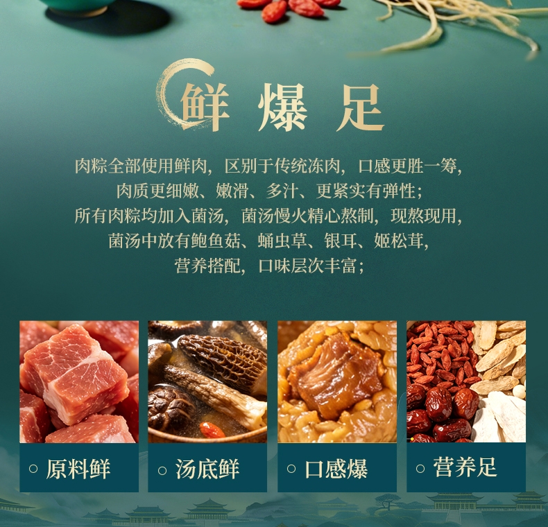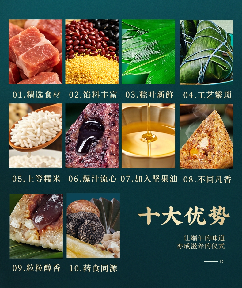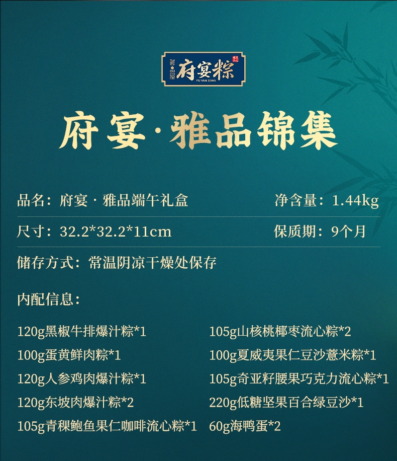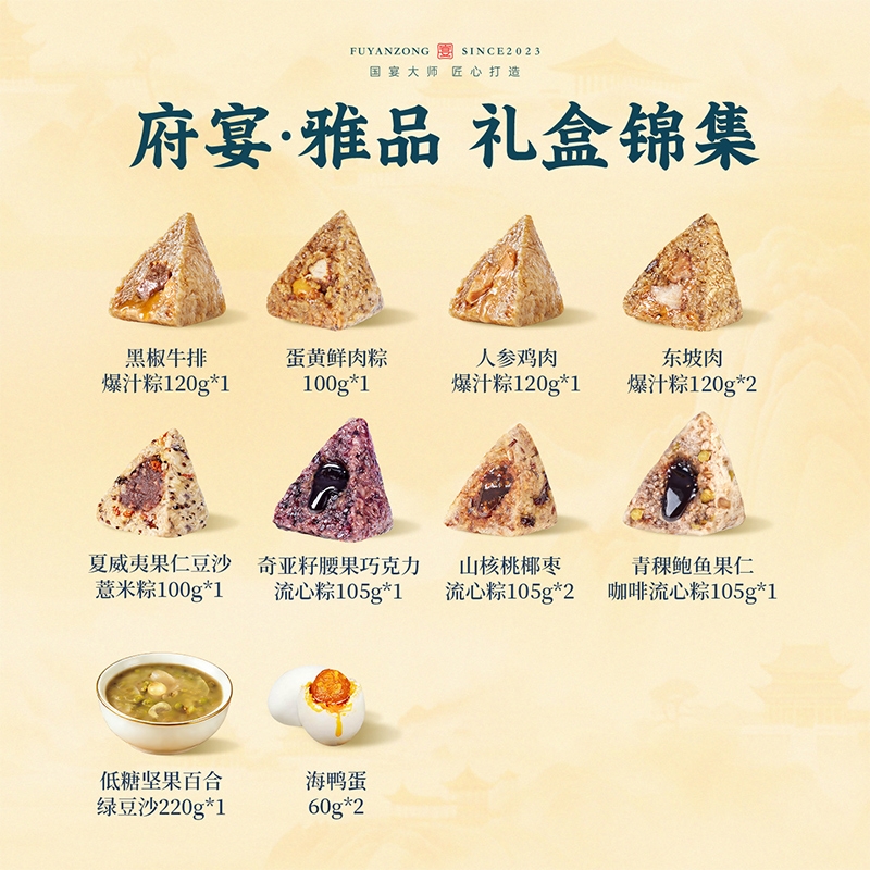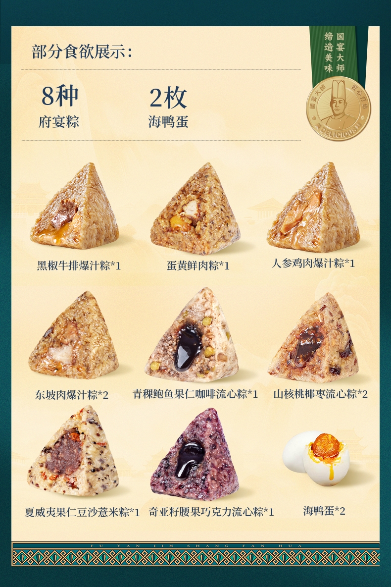 配置清单:1、鲜品屋-120g黑椒牛排爆汁粽*1 2、鲜品屋-100g蛋黄鲜肉粽*1 3、鲜品屋-120g人参鸡肉爆汁粽*1 4、鲜品屋-120g东坡肉爆汁粽*2 5、鲜品屋-105g青稞鲍鱼果仁咖啡流心粽*1 6、鲜品屋-105g山核桃椰枣流心粽*2 7、鲜品屋-100g夏威夷果仁豆沙薏米粽*1 8、鲜品屋-105g奇亚籽腰果巧克力流心粽*1 9、鲜品屋-220g低糖坚果百合绿豆沙*1 10、鲜品屋-60g海鸭蛋*2