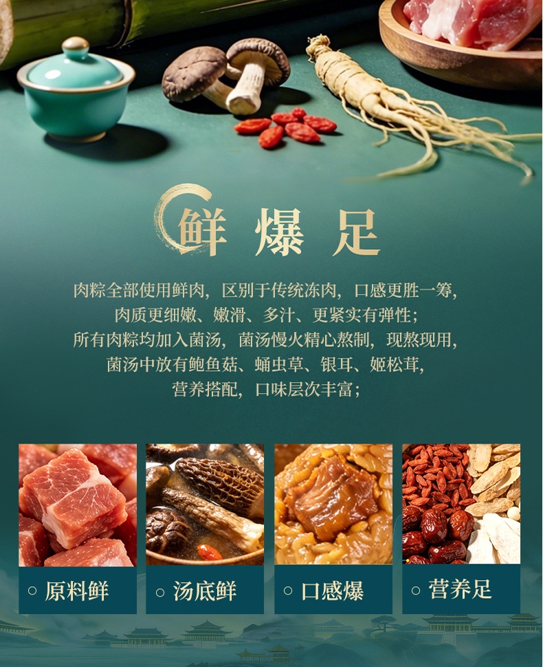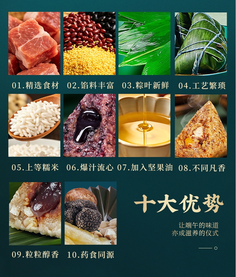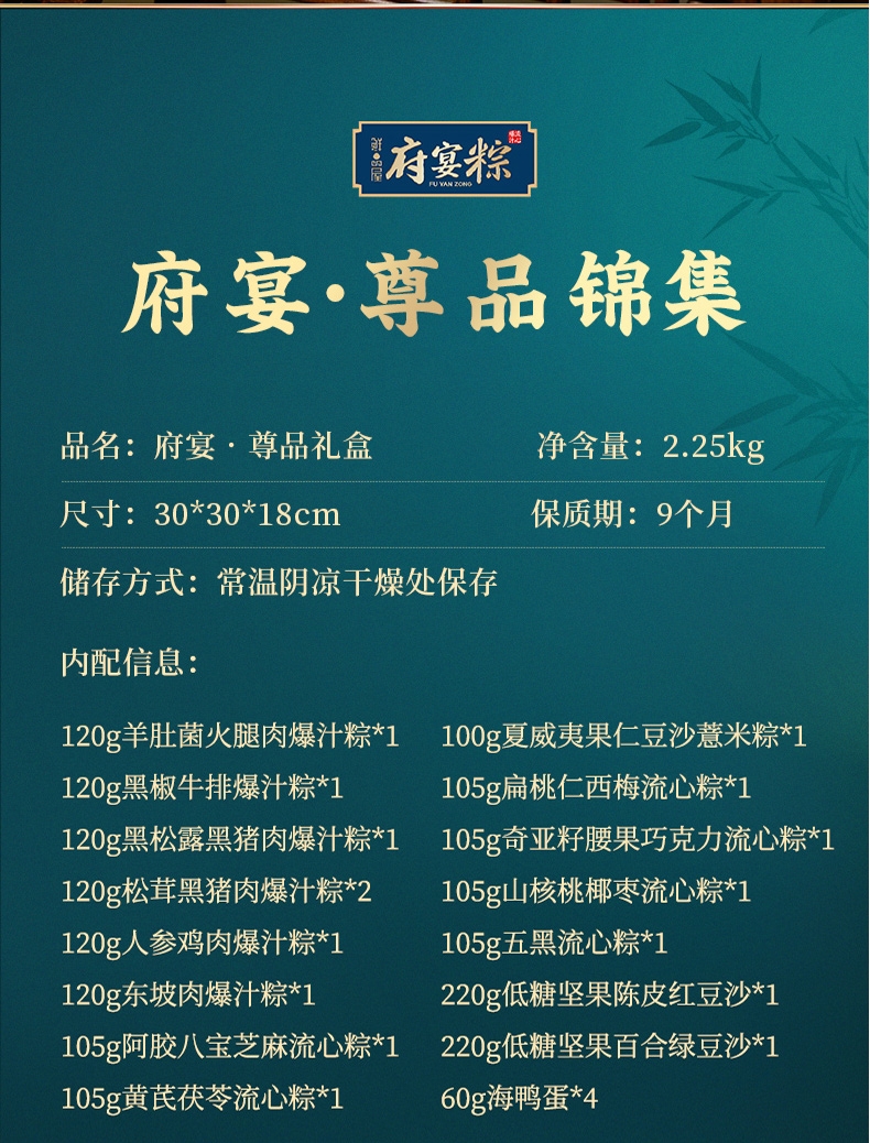 配置清单:1、鲜品屋-120g羊肚菌火腿肉爆汁粽*1 2、鲜品屋-120g黑椒牛排爆汁粽*1 3、鲜品屋-120g黑松露黑猪肉爆汁粽*1 4、鲜品屋-120g松茸黑猪肉爆汁粽*2 5、鲜品屋-120g人参鸡肉爆汁粽*1 6、鲜品屋-120g东坡肉爆汁粽*1 7、鲜品屋-105g阿胶八宝芝麻流心粽*1 8、鲜品屋-105g黄芪茯苓流心粽*1 9、鲜品屋-100g夏威夷果仁豆沙薏米粽*1 10、鲜品屋-105g扁桃仁西梅流心粽*1 11、鲜品屋-105g奇亚籽腰果巧克力流心粽*1 12、鲜品屋-105g山核桃椰枣流心粽*1 13、鲜品屋-105g五黑流心粽*1 14、鲜品屋-220g低糖坚果陈皮红豆沙*1 15、鲜品屋-220g低糖坚果百合绿豆沙*1 16、鲜品屋-60g海鸭蛋*4