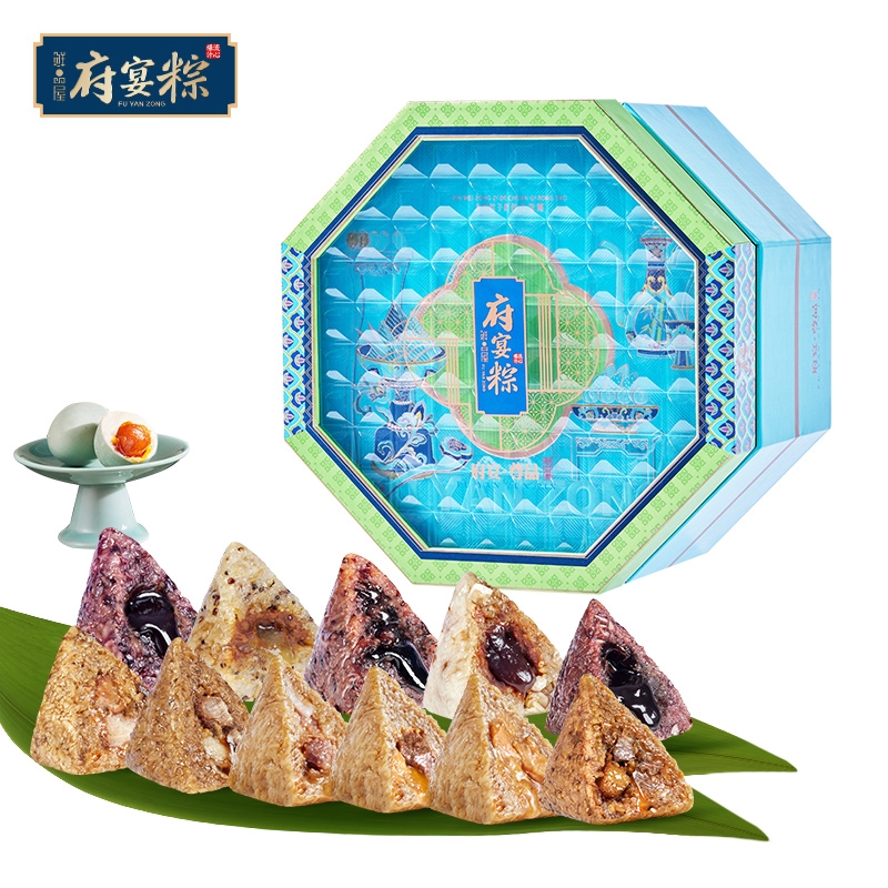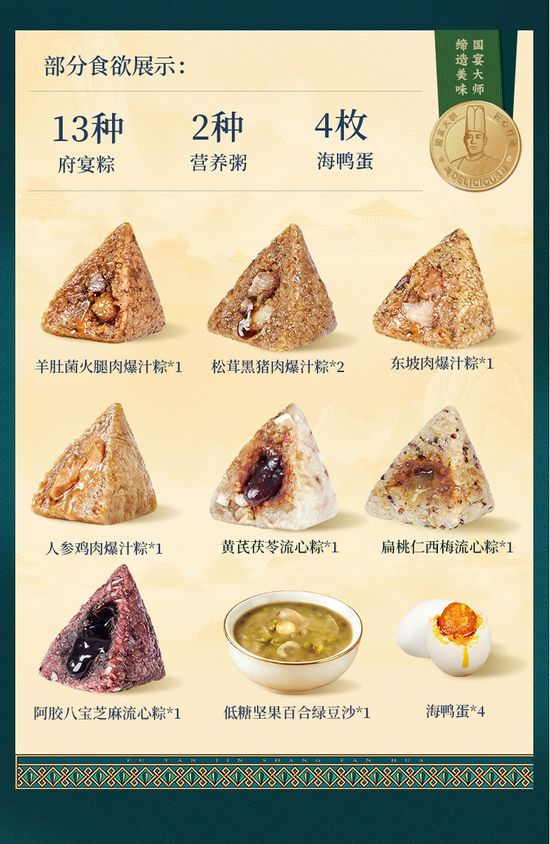 鲜品屋端午节高端府宴粽子礼盒;企业团购福利送礼送父母长辈;14粽12味,6肉8素搭配银耳羹绿豆沙4枚海鸭蛋