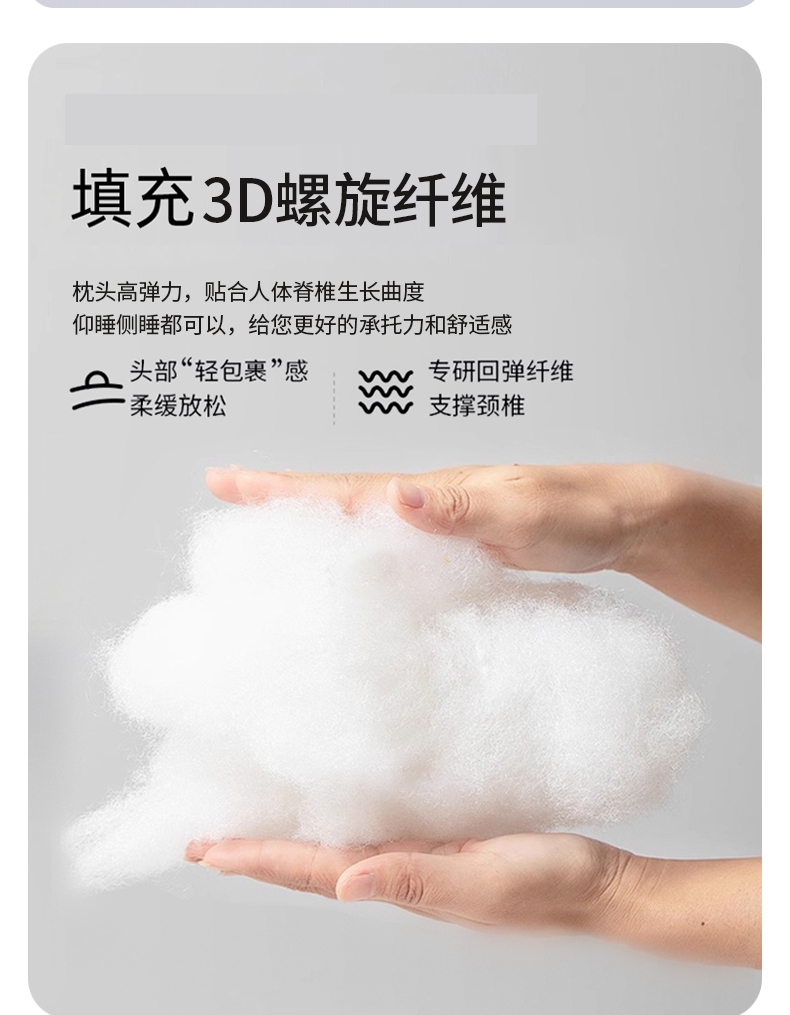 手感柔软;填充采用3D螺旋纤维;回弹好,长期使用不变形,不结团。