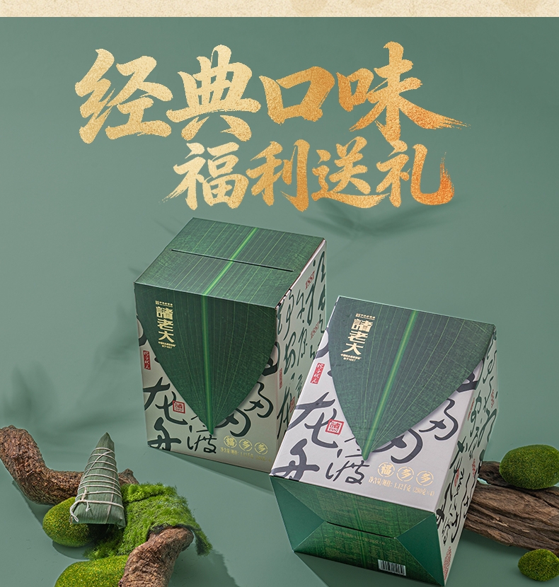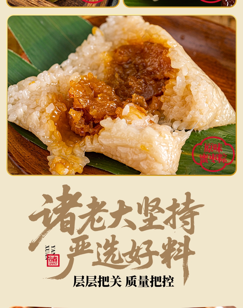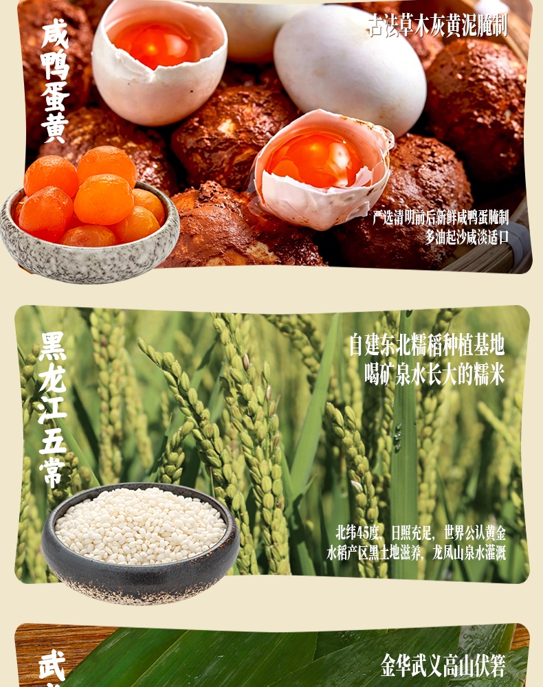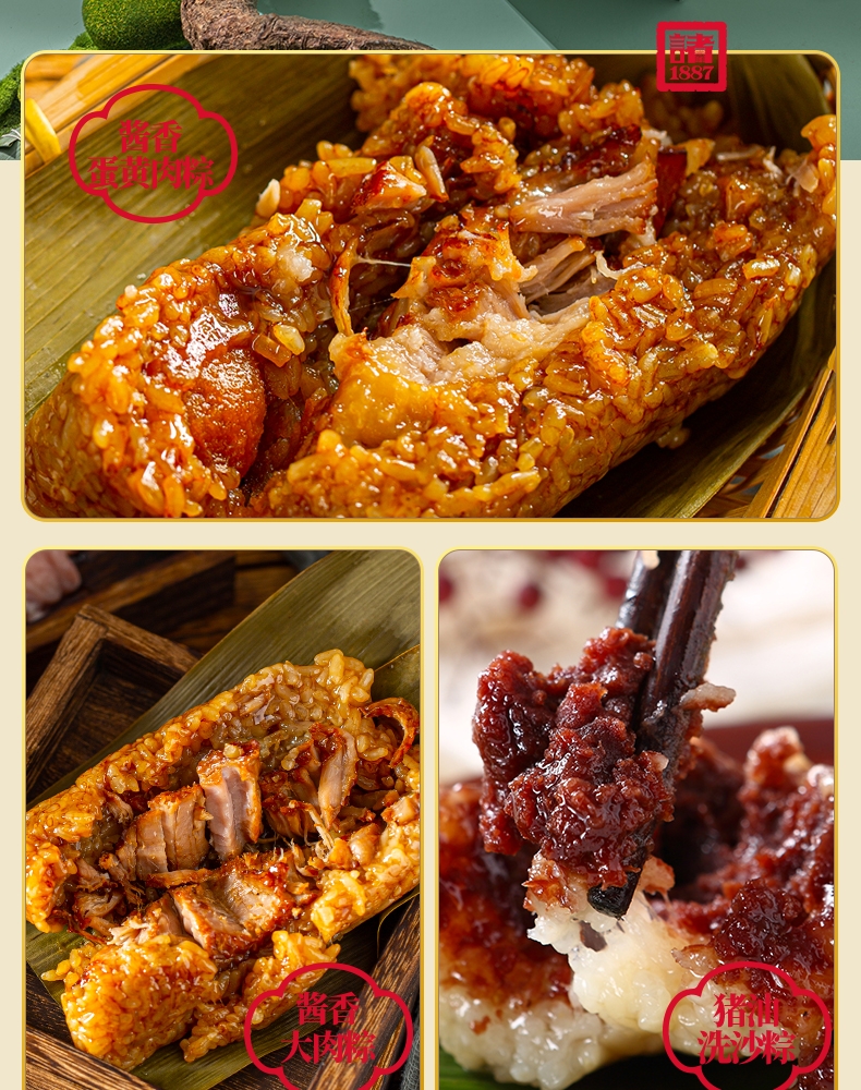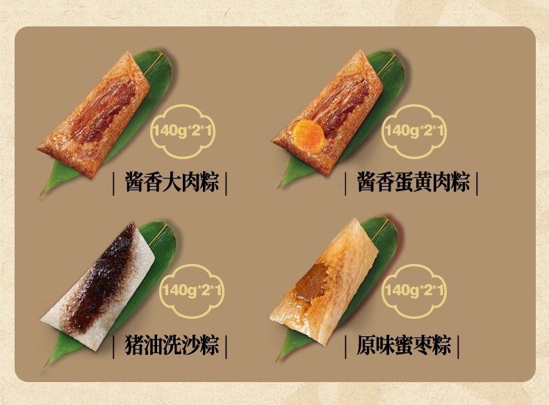配置清单:140克*2真空酱香大肉粽 140克*2真空酱香蛋黄肉粽 140克*2真空猪油洗沙粽 140克*2真空原味蜜枣粽