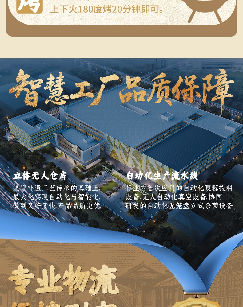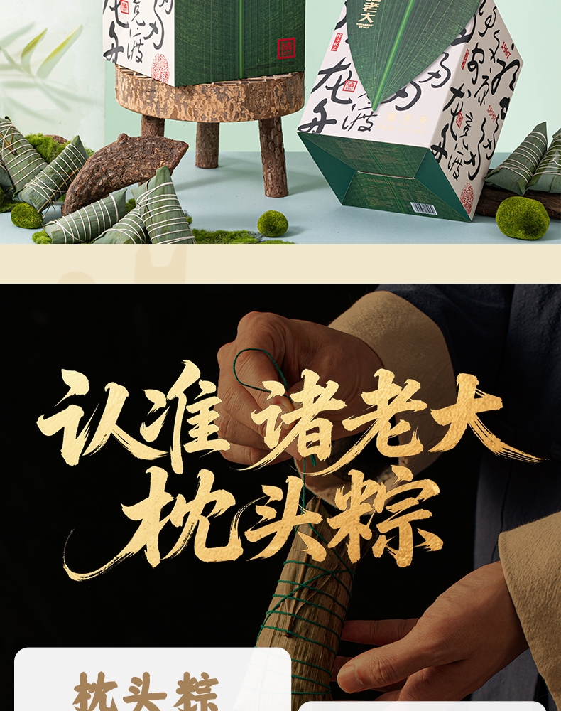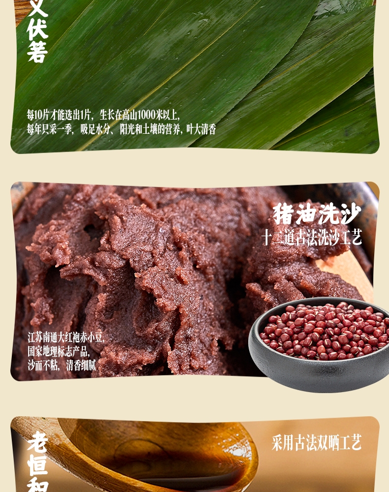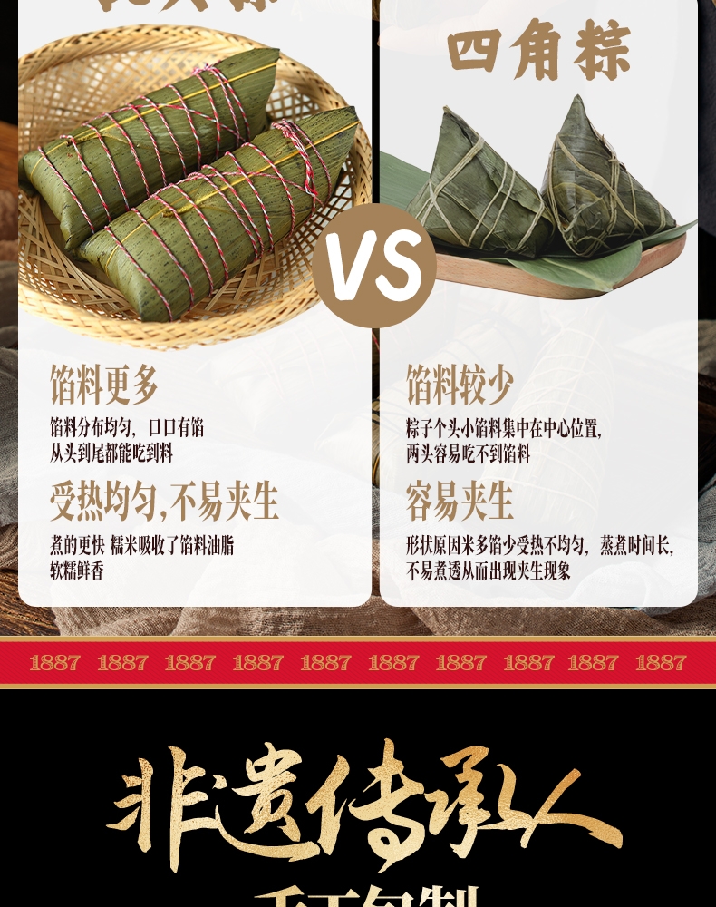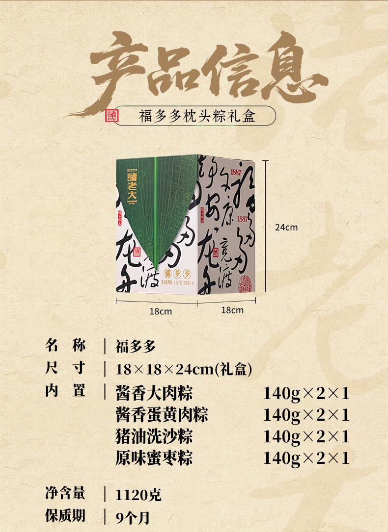 配置清单:140克*2真空酱香大肉粽 140克*2真空酱香蛋黄肉粽 140克*2真空猪油洗沙粽 140克*2真空原味蜜枣粽