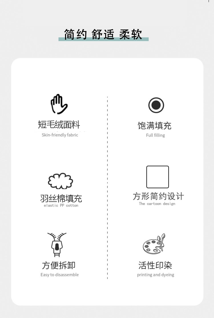 采用短毛绒面料,颜色鲜艳;手感光滑流畅;填充环保羽丝纤维,轻薄透气