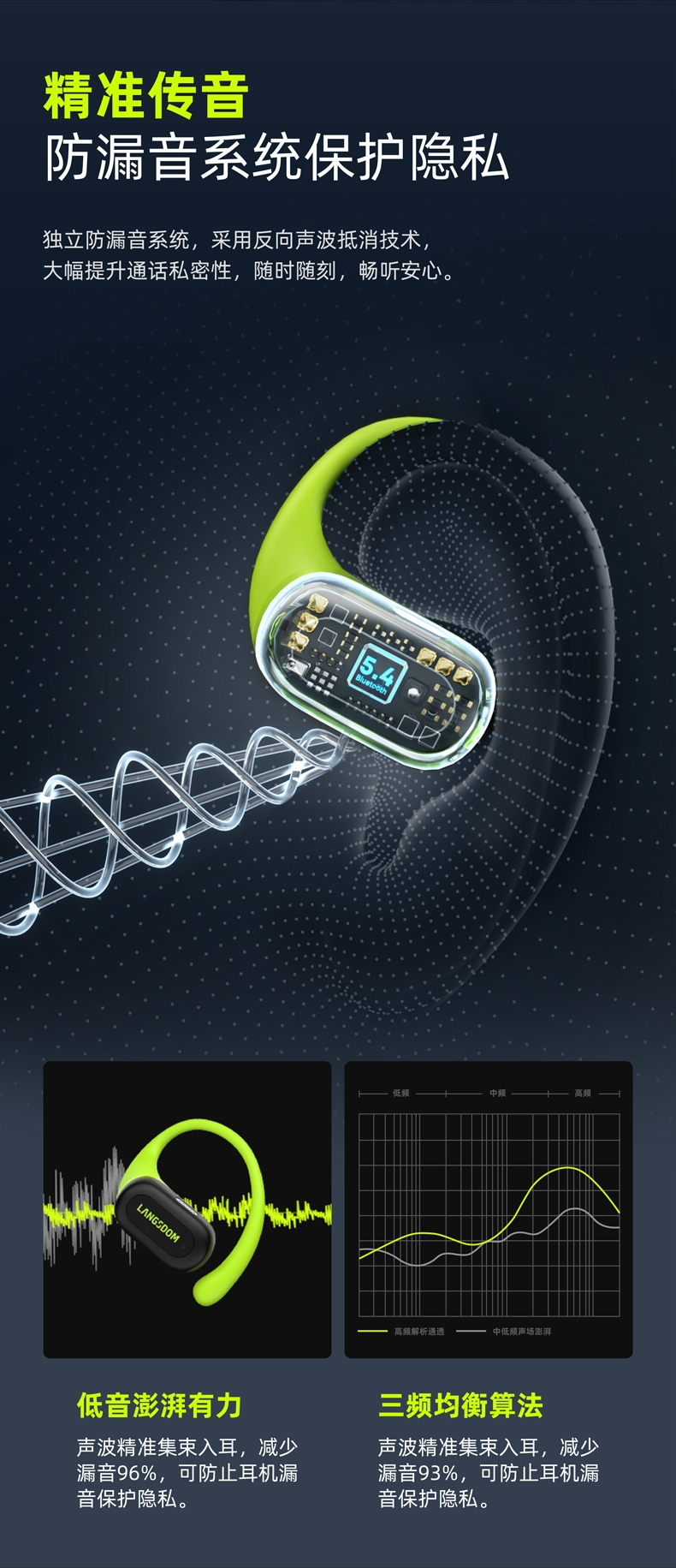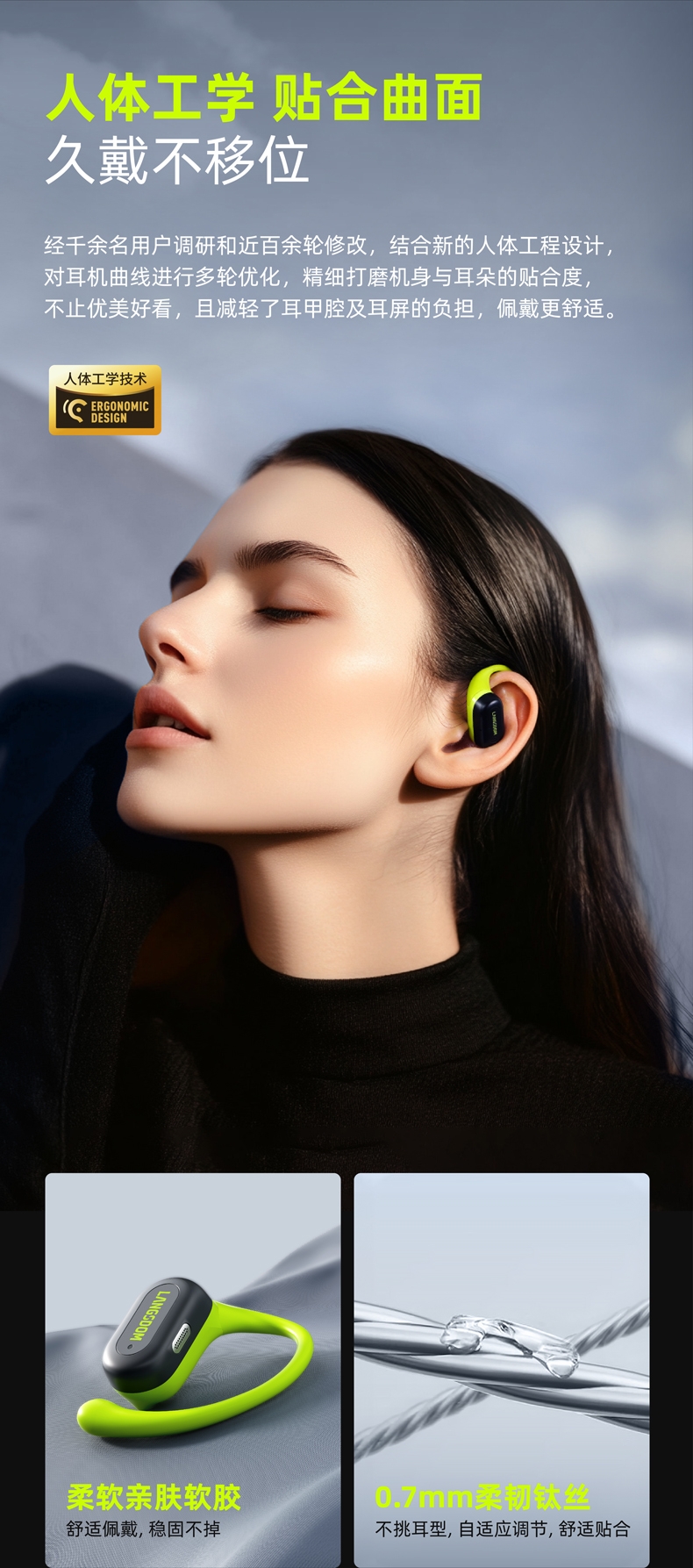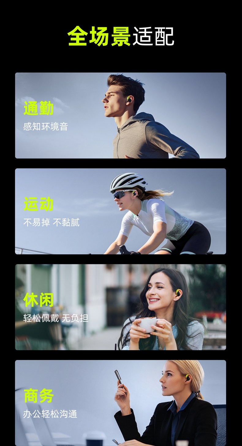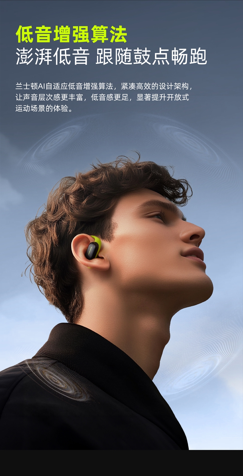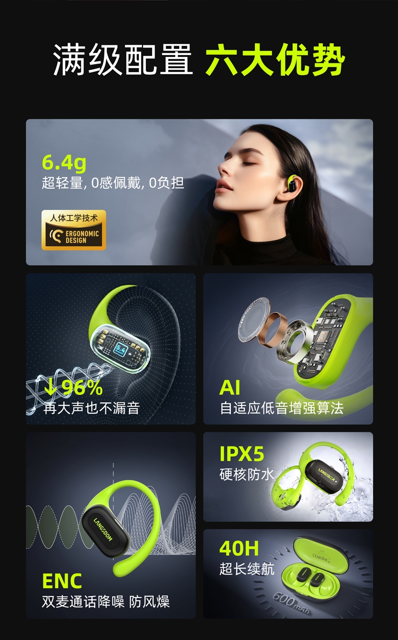 6.4g 超轻机身,弧形耳挂舒适防掉,运动安全;IPX5 防水 + 40 小时续航,畅享动感音乐;开放不入耳设计,AI 增强重低音,健康舒适