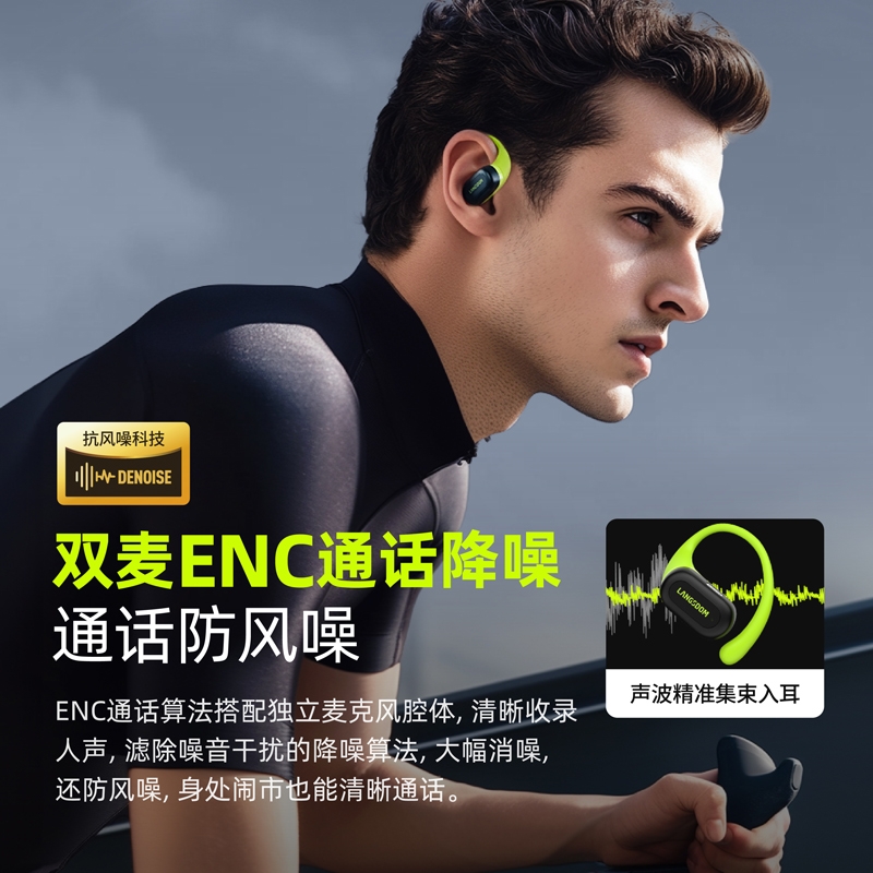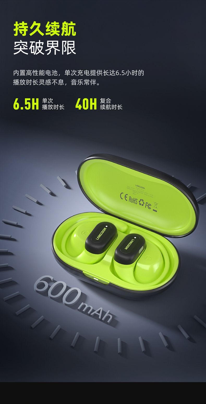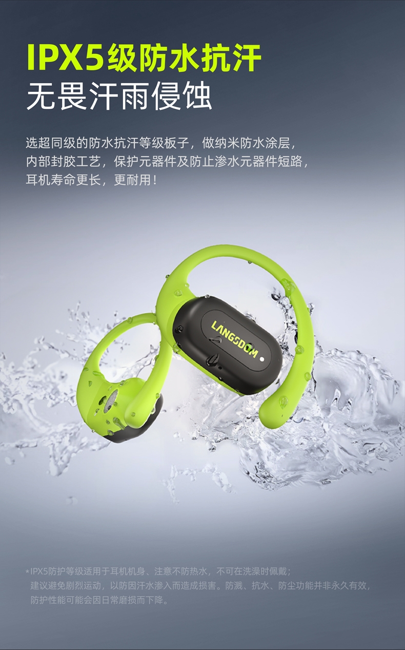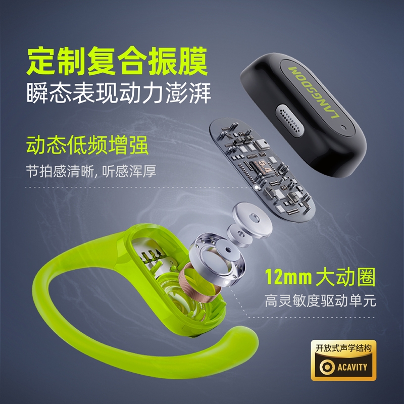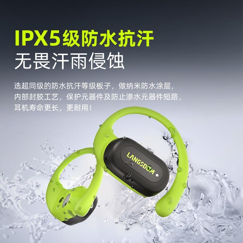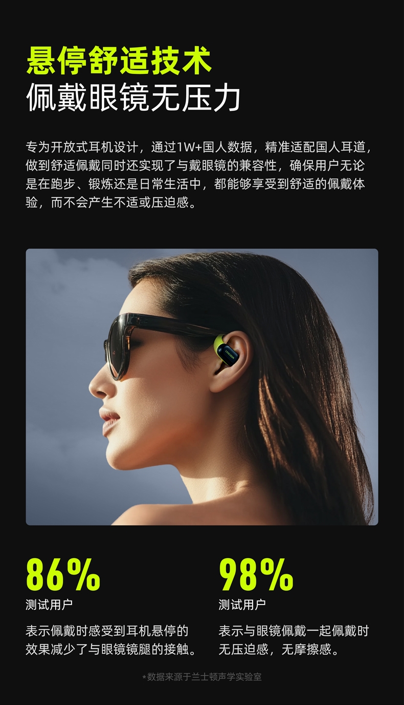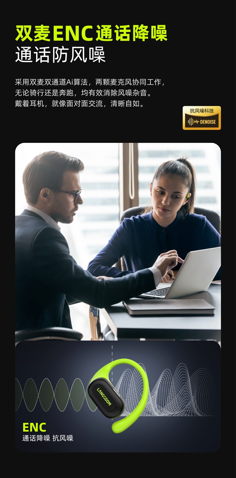 6.4g 超轻机身,弧形耳挂舒适防掉,运动安全;IPX5 防水 + 40 小时续航,畅享动感音乐;开放不入耳设计,AI 增强重低音,健康舒适