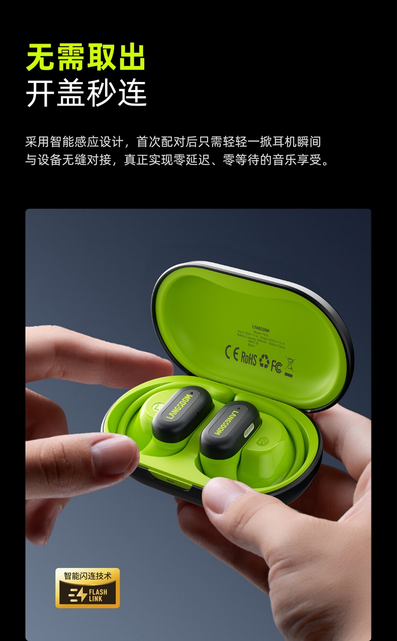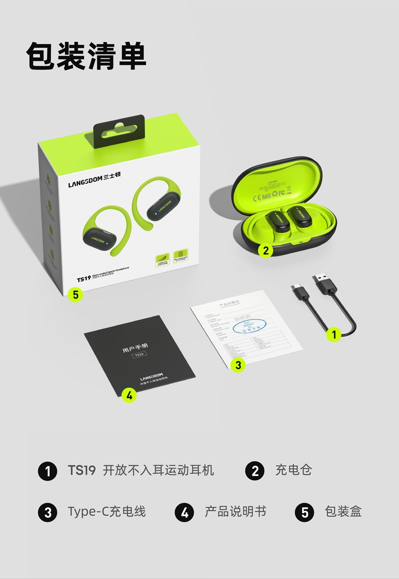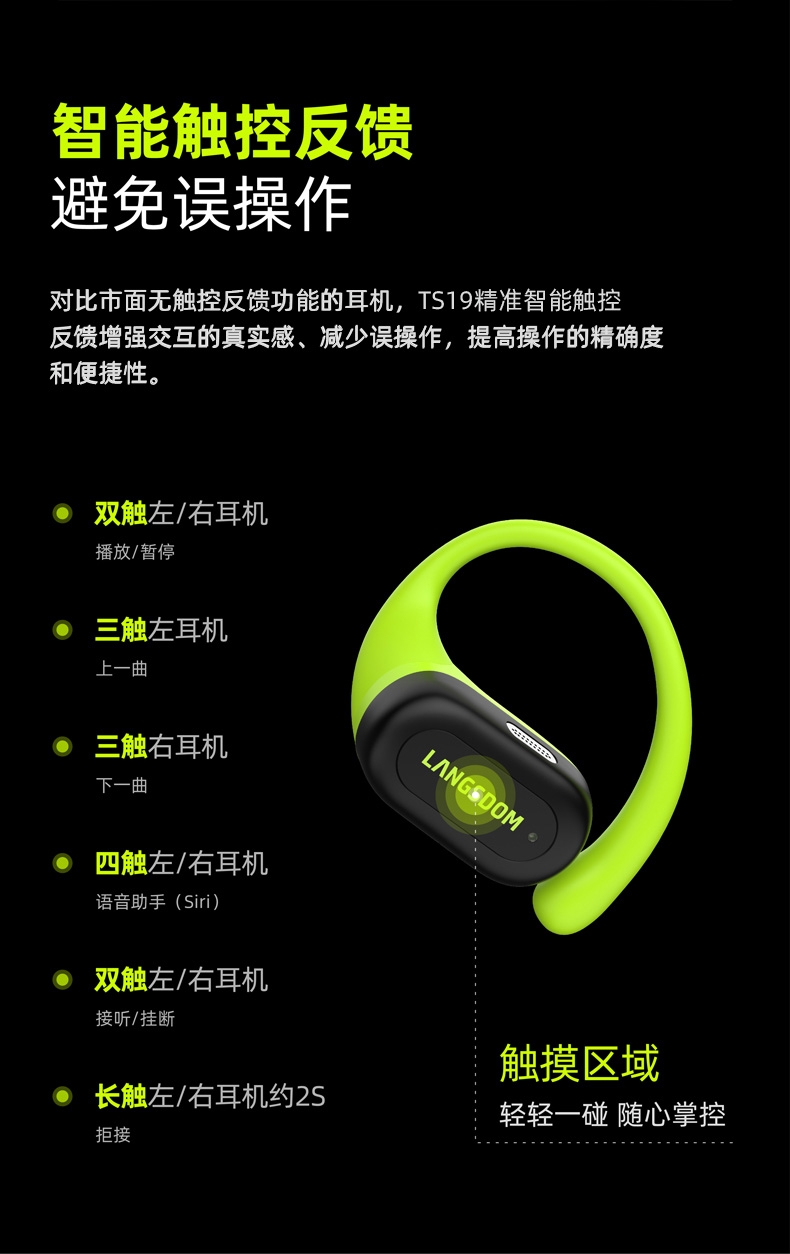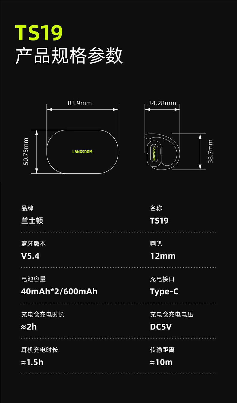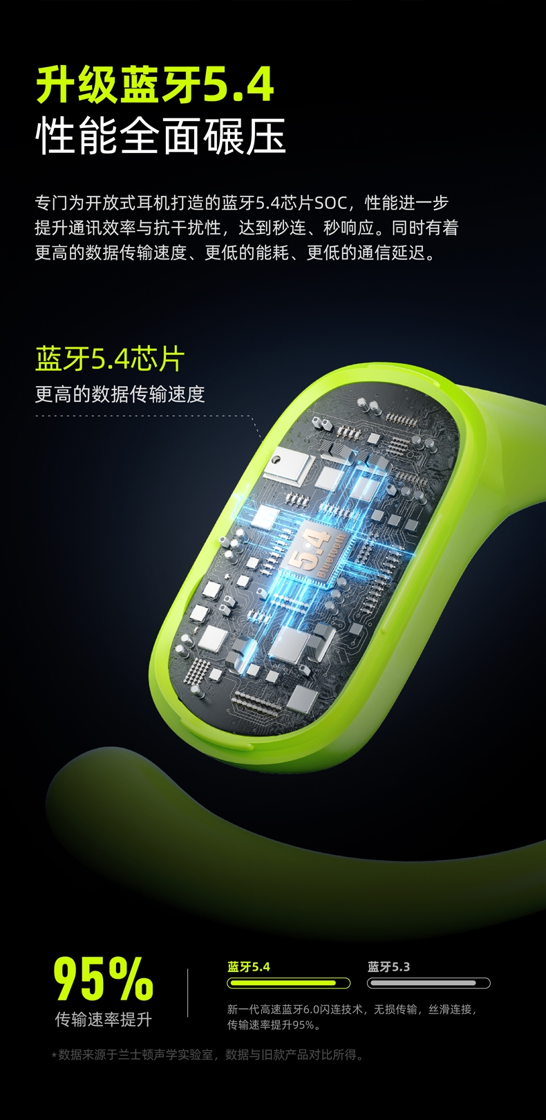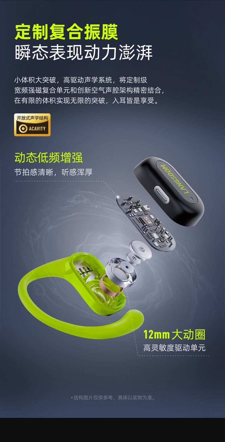 6.4g 超轻机身,弧形耳挂舒适防掉,运动安全;IPX5 防水 + 40 小时续航,畅享动感音乐;开放不入耳设计,AI 增强重低音,健康舒适