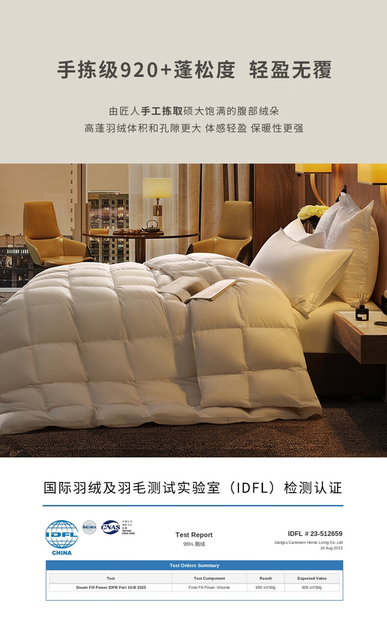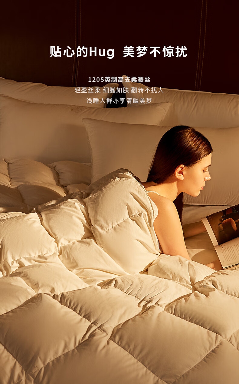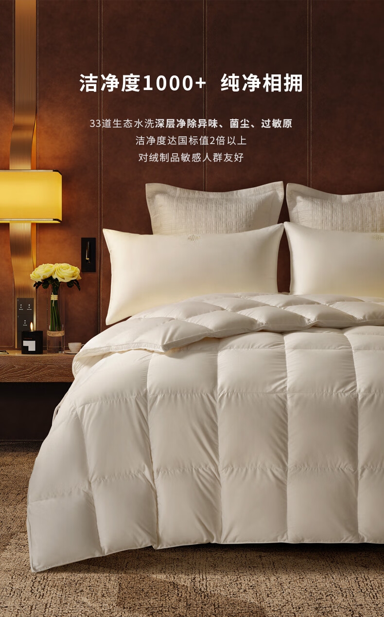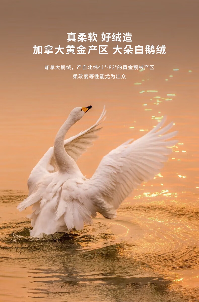 手拣级920+蓬松度;高支高密,120S英制高支柔赛丝;加拿白大鹅绒