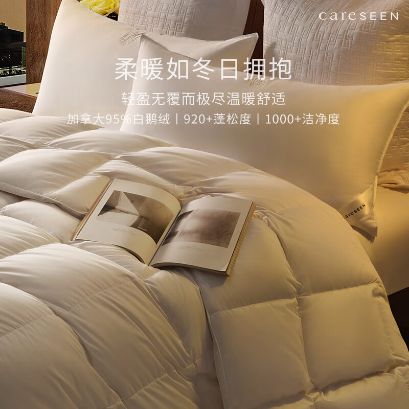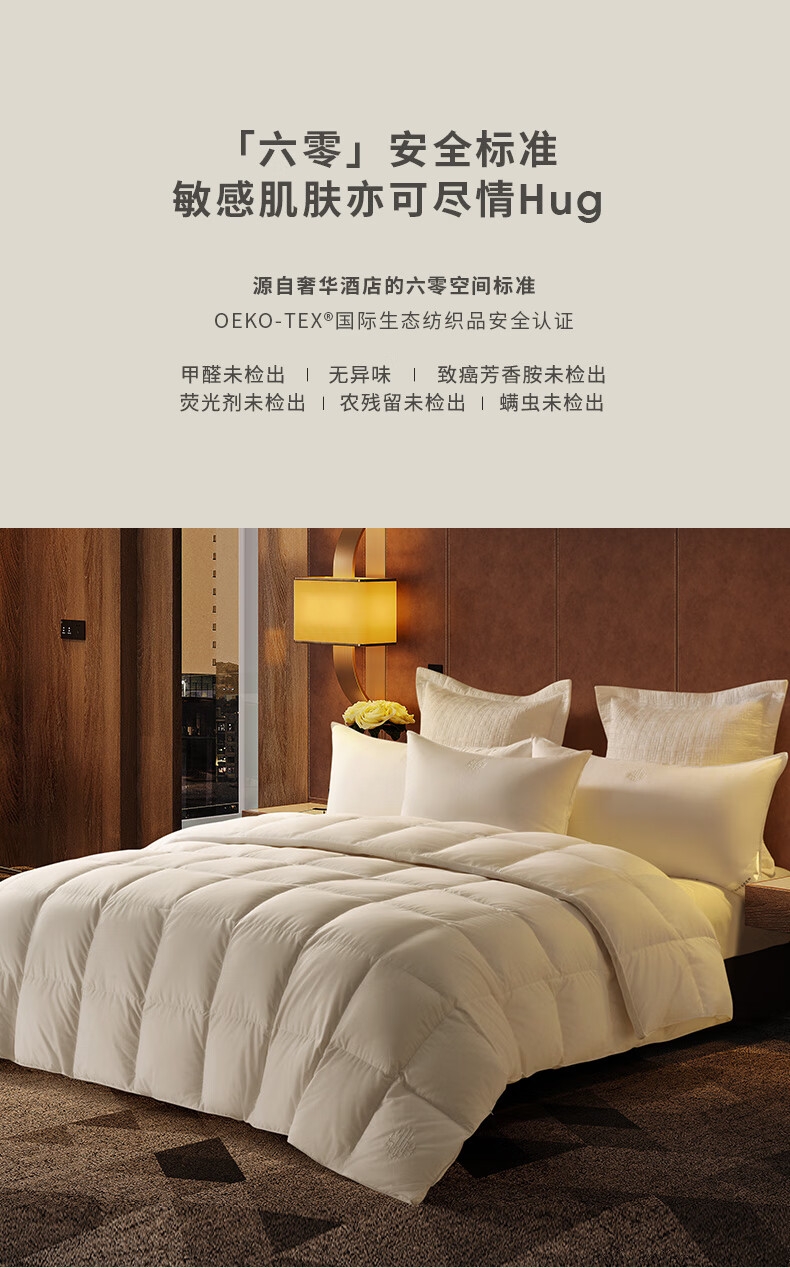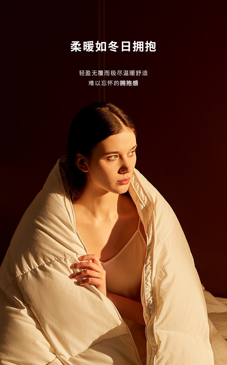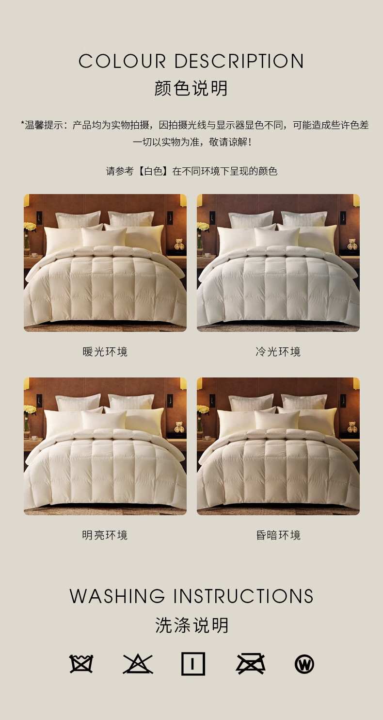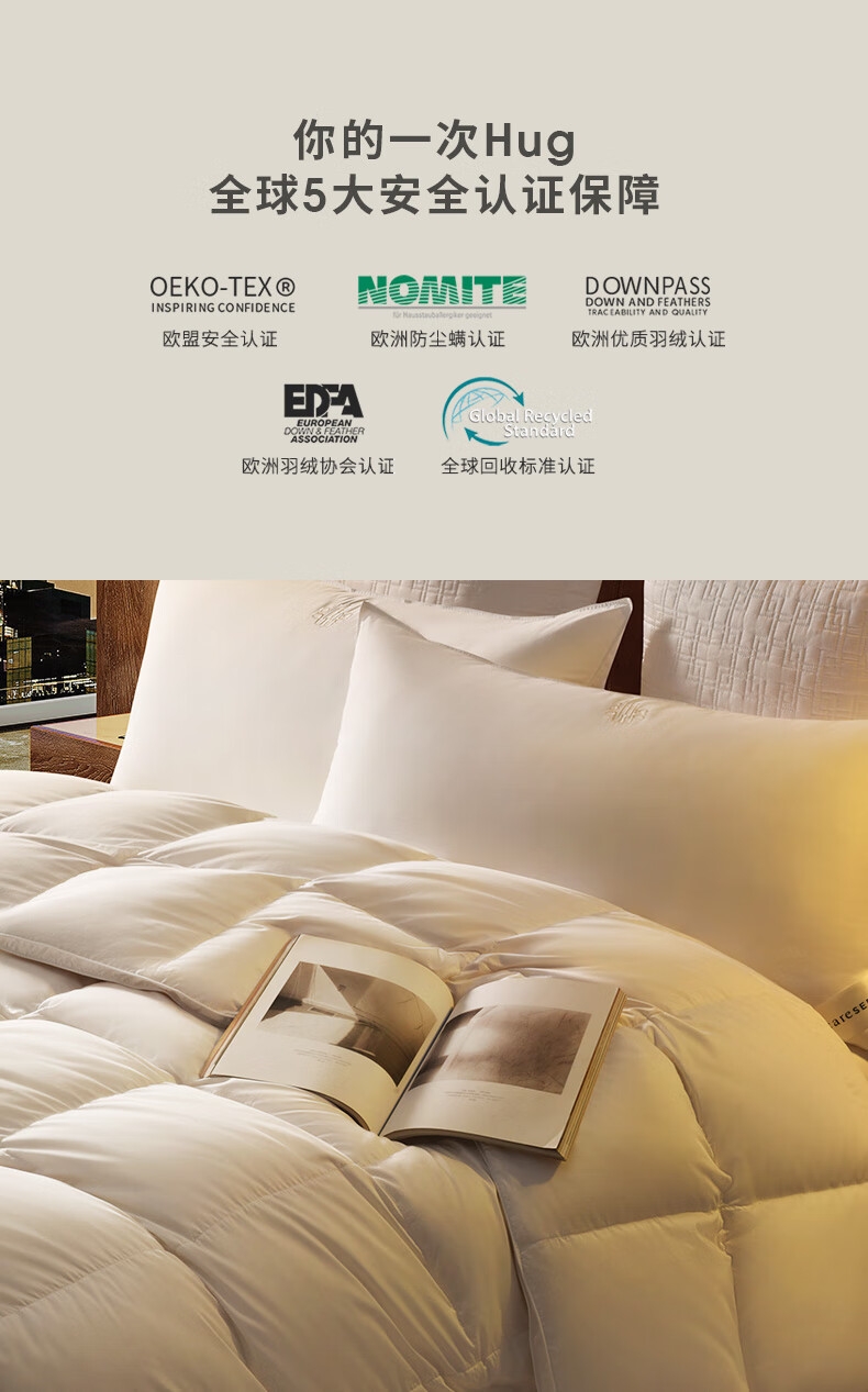 手拣级920+蓬松度;高支高密,120S英制高支柔赛丝;加拿白大鹅绒