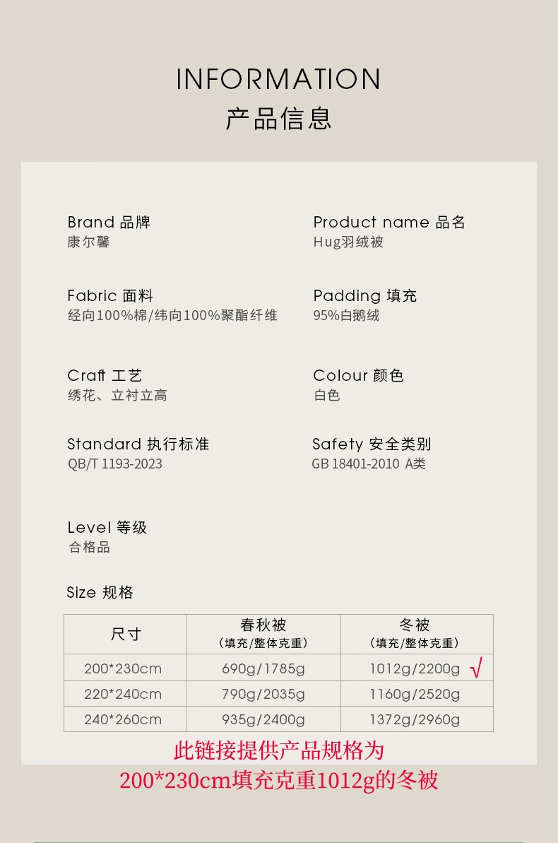 规格:200*230cm/填充克重1012g/整体克重2200g