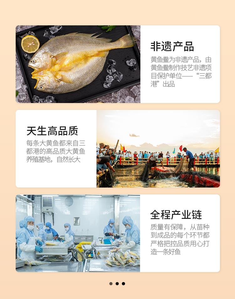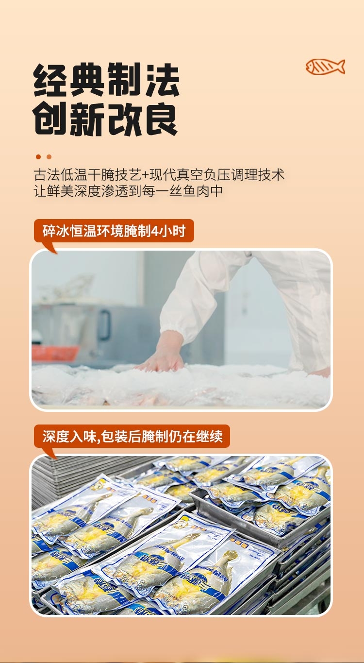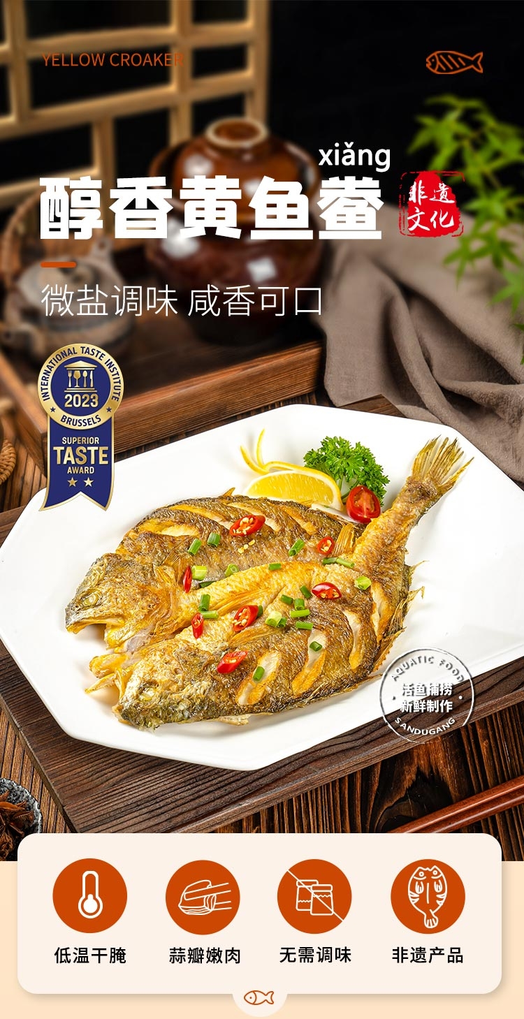 “黄鱼鲞制作技艺”非遗项目保护单位出品; 少盐浅调味; 碎冰低温干腌腌制;;热销全国20年; 荣获国际美味奖章