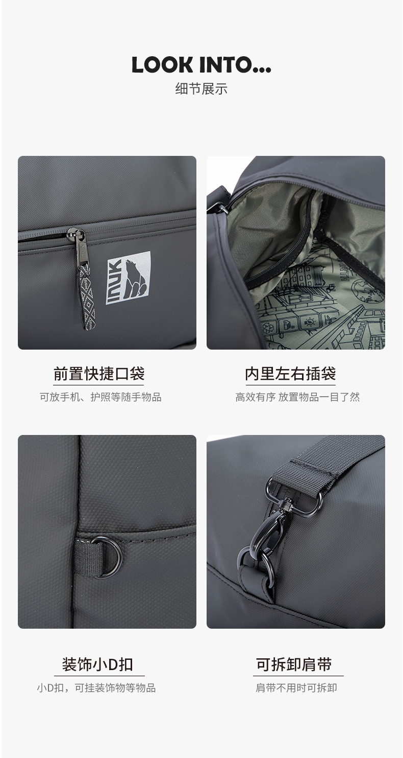 有背插 可套拉杆;涤纶( 900D RPET涤纶涂层);附赠INUK 印花鞋袋