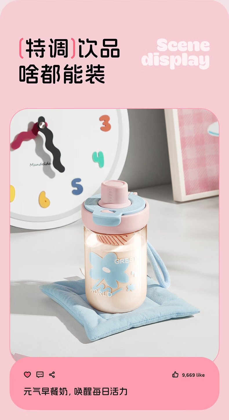 Tritan材质,宝宝般健康呵护;可拆卸吸管,清洗无忧,360°随意放置,滴水不漏;一键开盖,过滤茶球,珍珠提手,安全锁扣