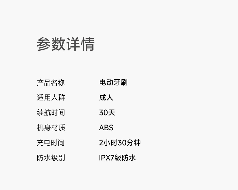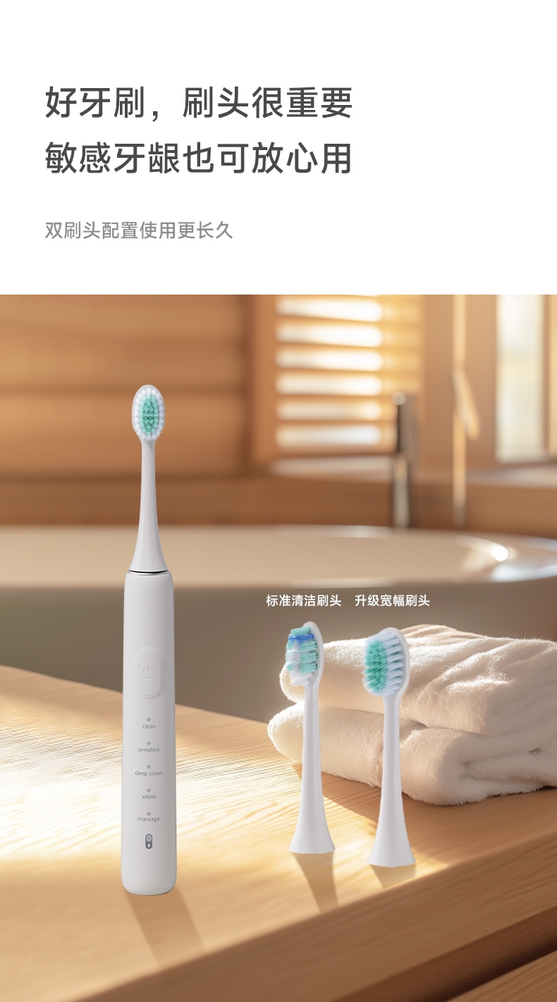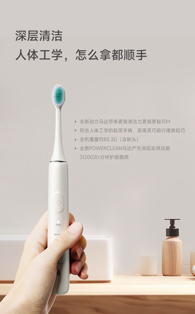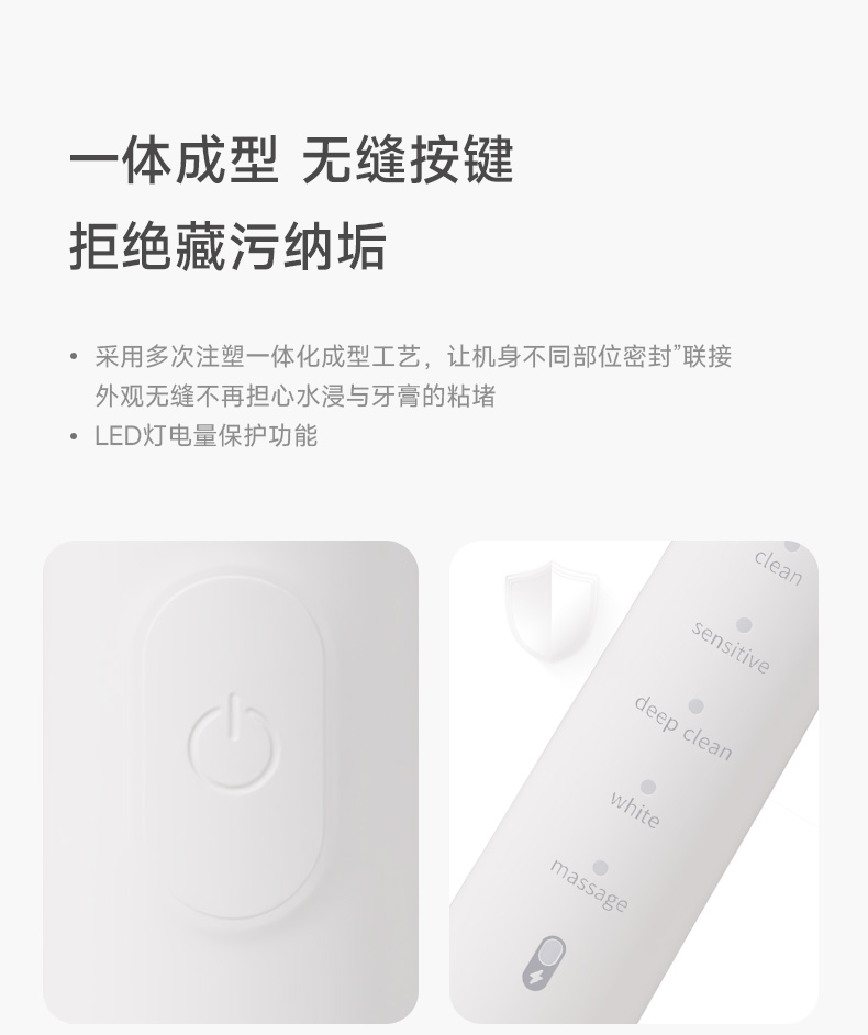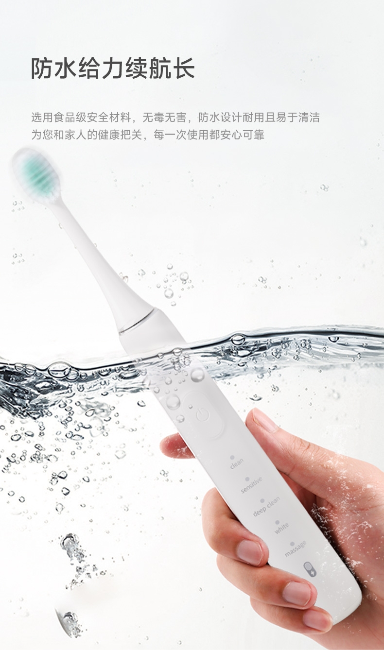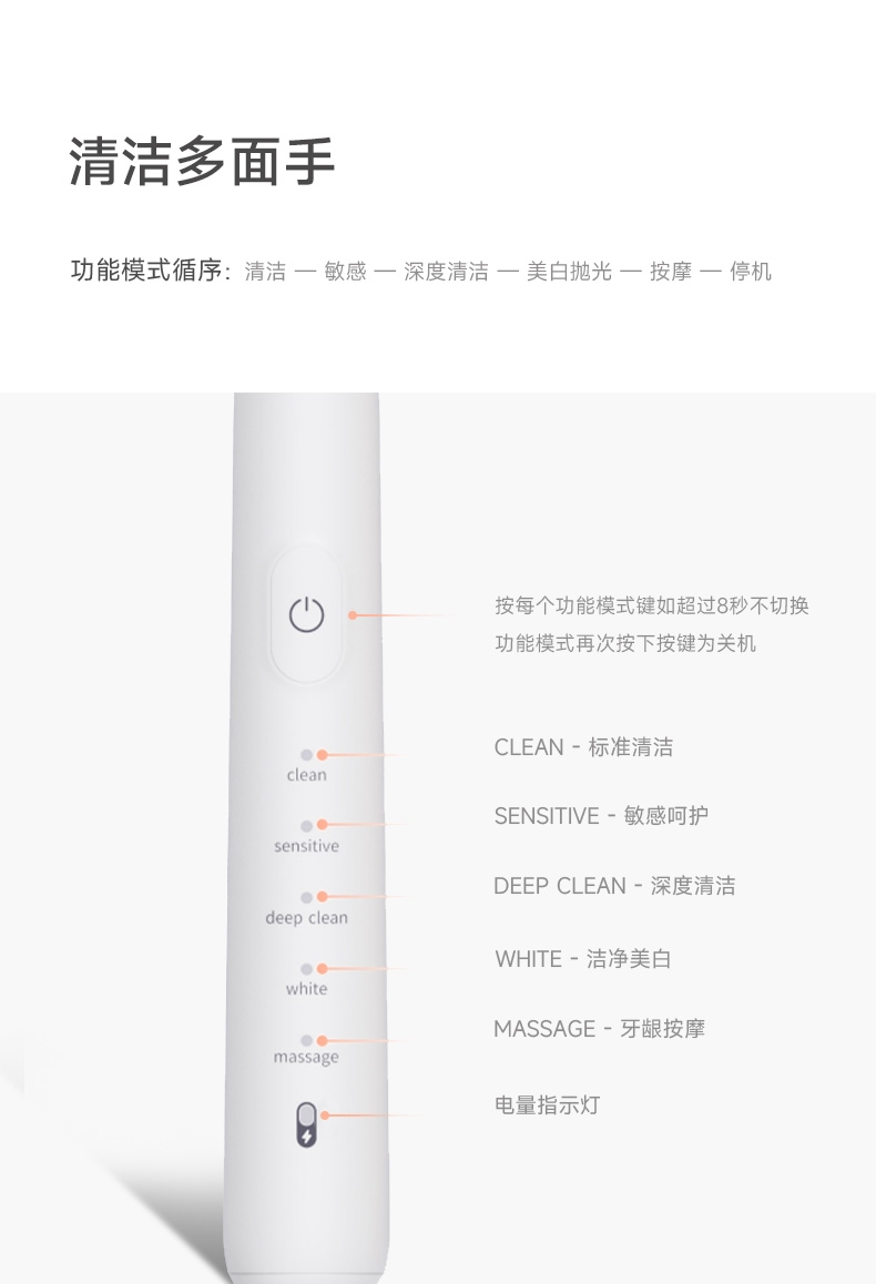全新动力马达带来更强清洁力更细更轻巧M;Ipx7防水,随心所“浴”清洗可以毫不费力杜邦刷毛;5种清洁模式,应对不同强度需求