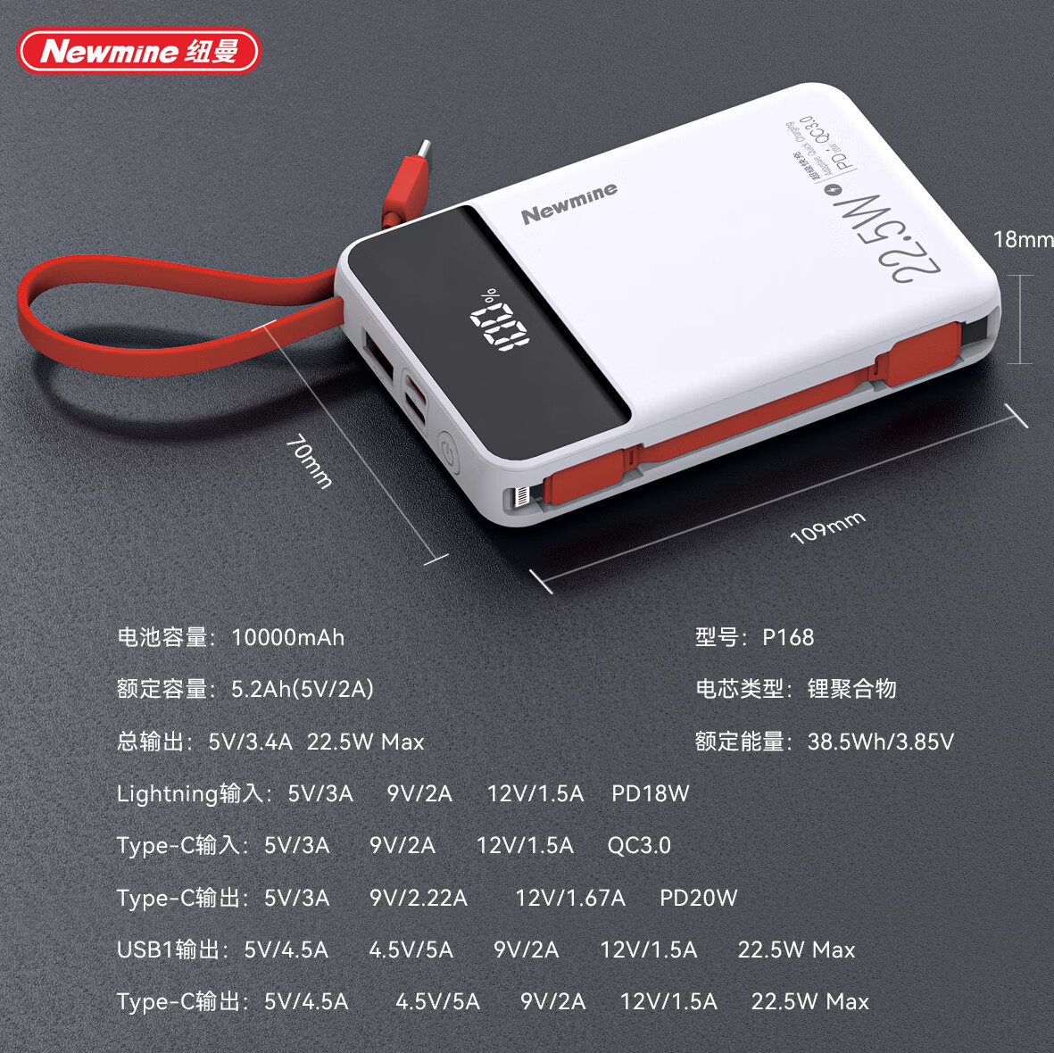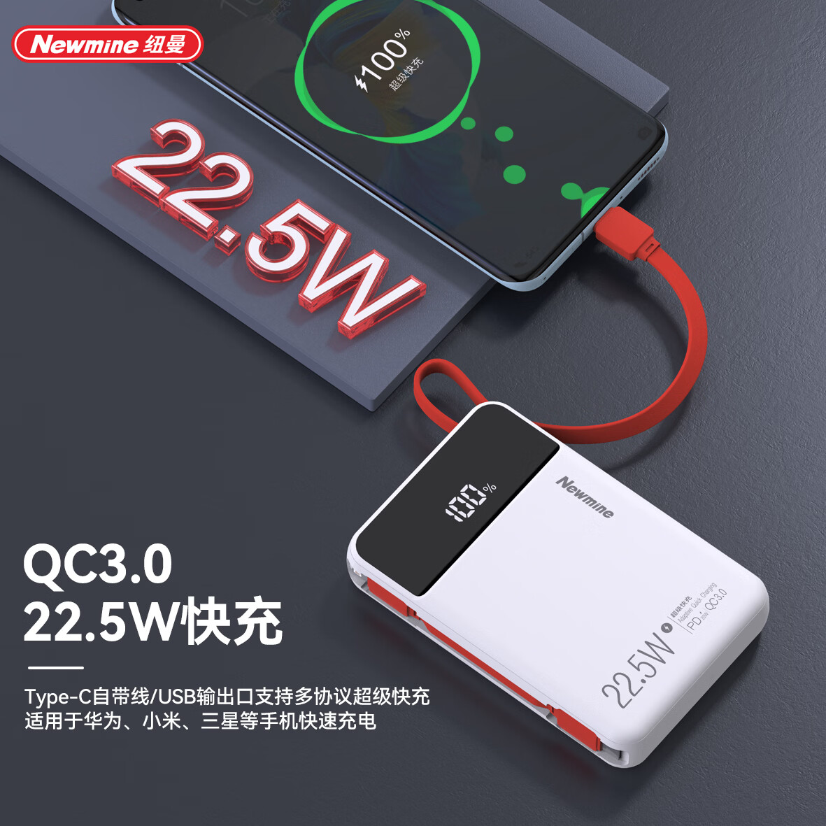 自带可拆卸线;迷你快充22.5W充电宝新国标3C 可上飞机;带数显