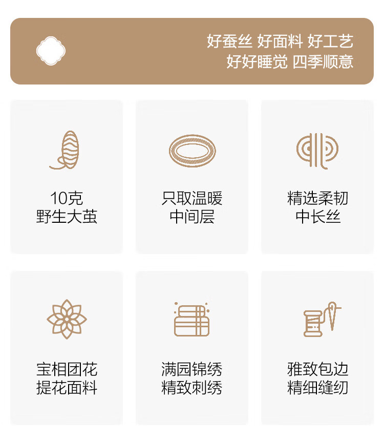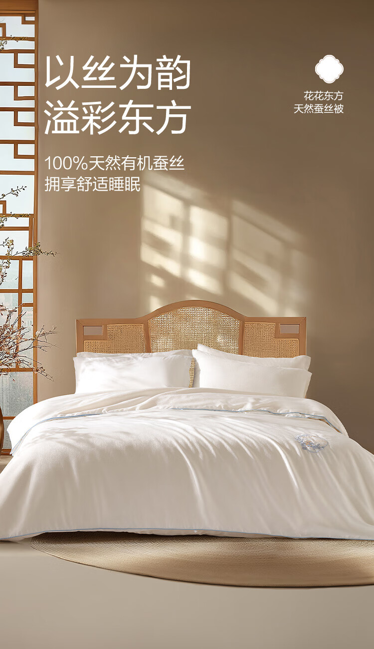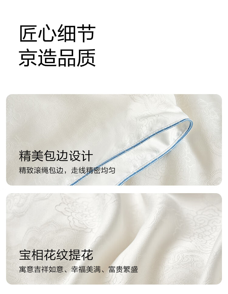 以丝为韵溢彩东方 100%天然有机蚕丝拥亨舒适睡眠;满园风光 梅香浮动 重工贡缎提花刺绣搭配宝相花纹提;好蚕丝 好面料 好工艺好好睡觉 四季顺意