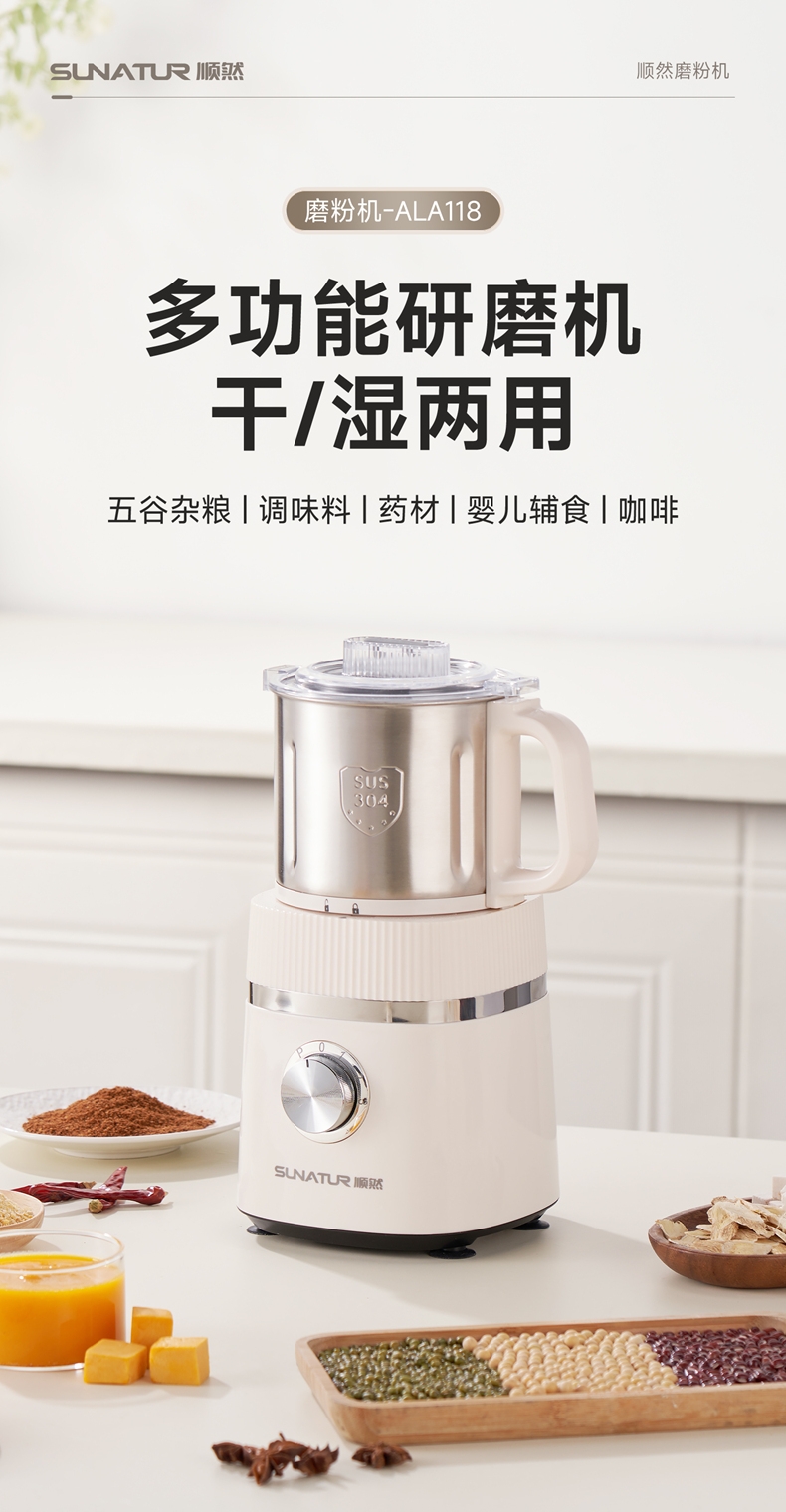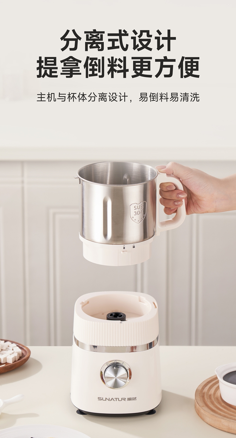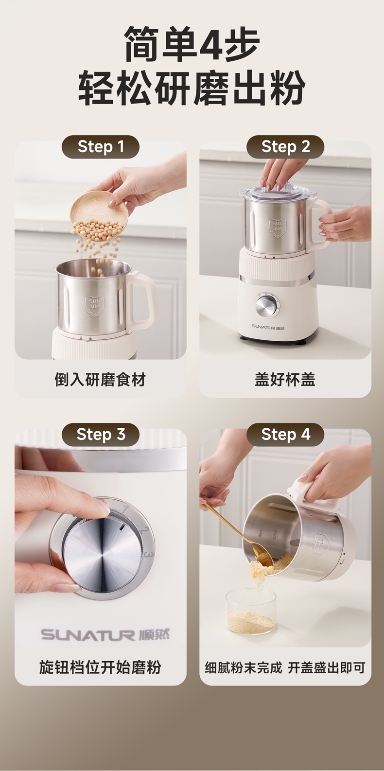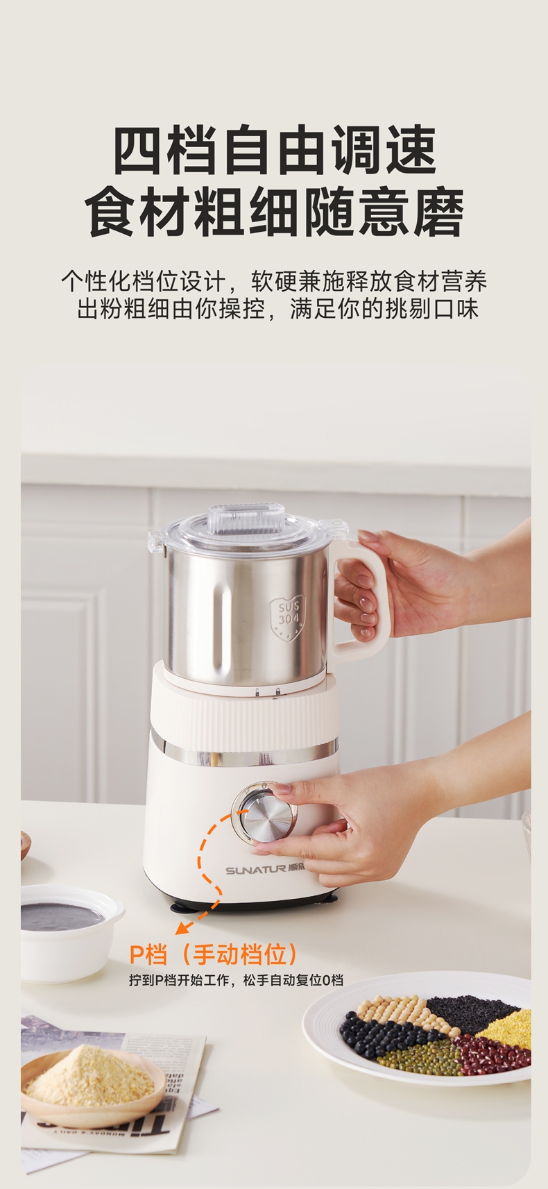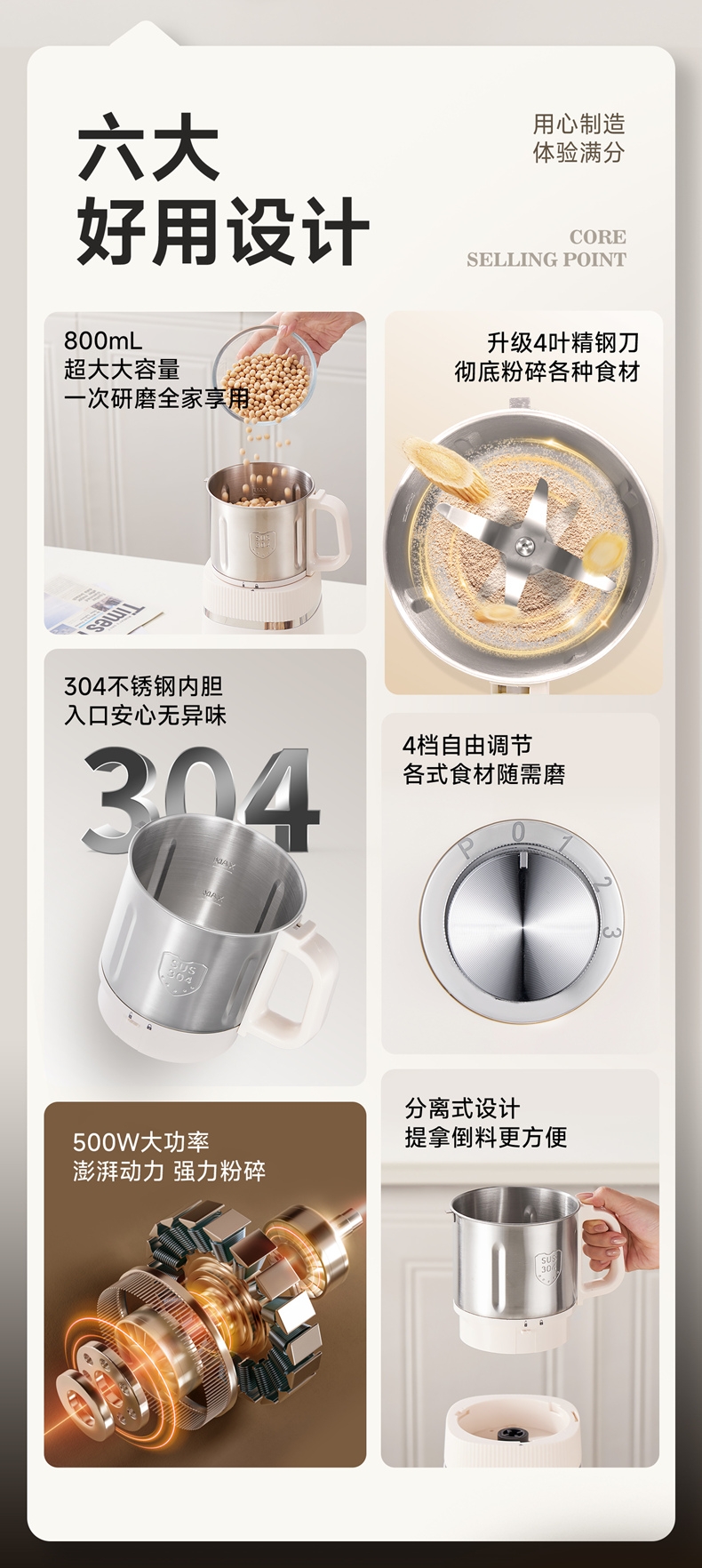 500W大功率电机 高速精细研磨 800ml大容量;精钢4叶精钢刀 出粉细腻 304SUS不锈钢内胆;四档自由调速 主机与杯体分离设计 三重安装保护