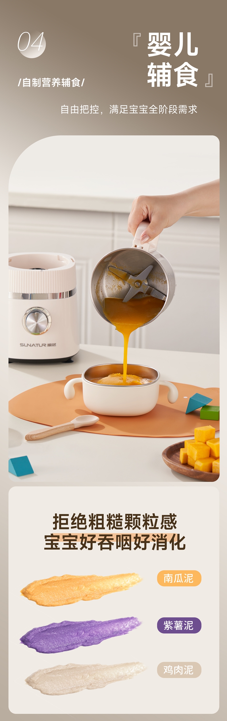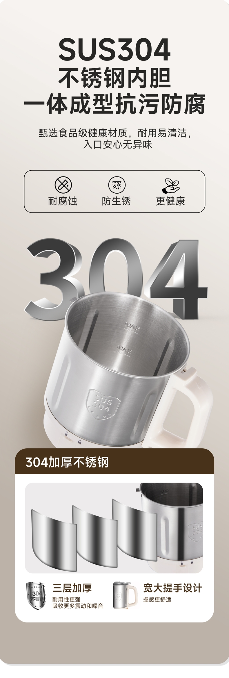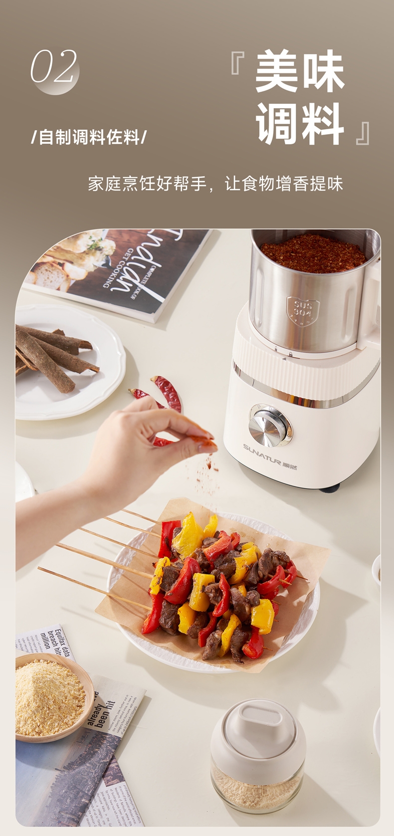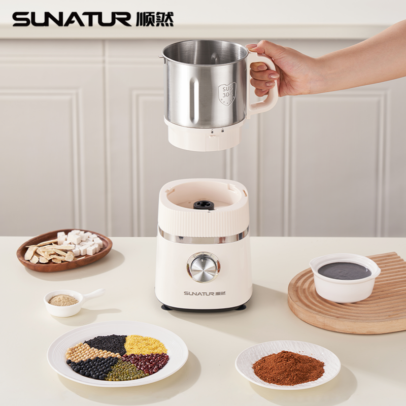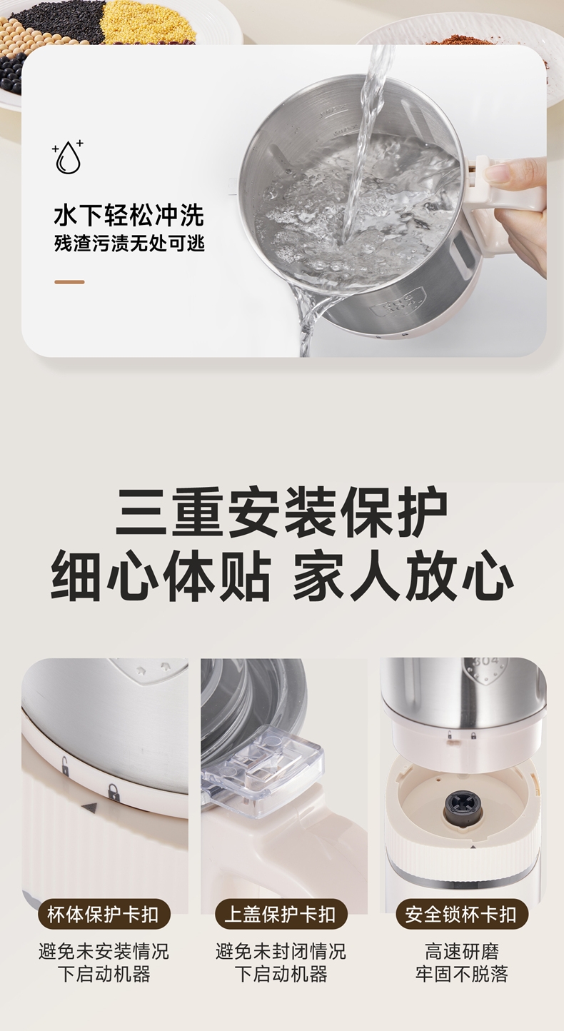 500W大功率电机 高速精细研磨 800ml大容量;精钢4叶精钢刀 出粉细腻 304SUS不锈钢内胆;四档自由调速 主机与杯体分离设计 三重安装保护