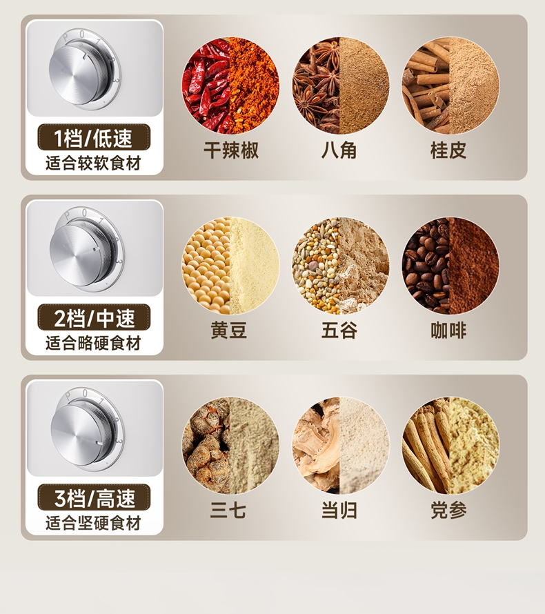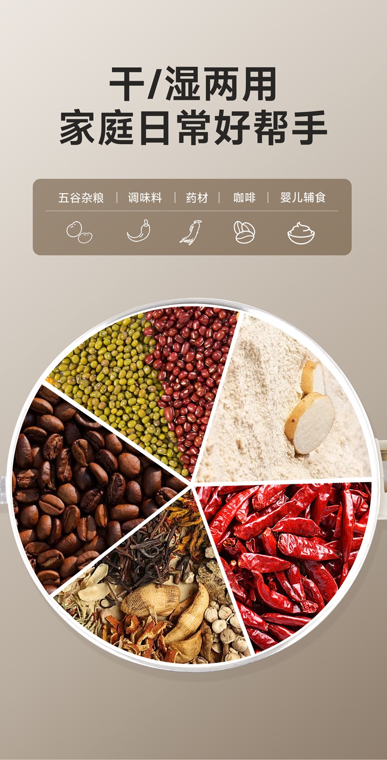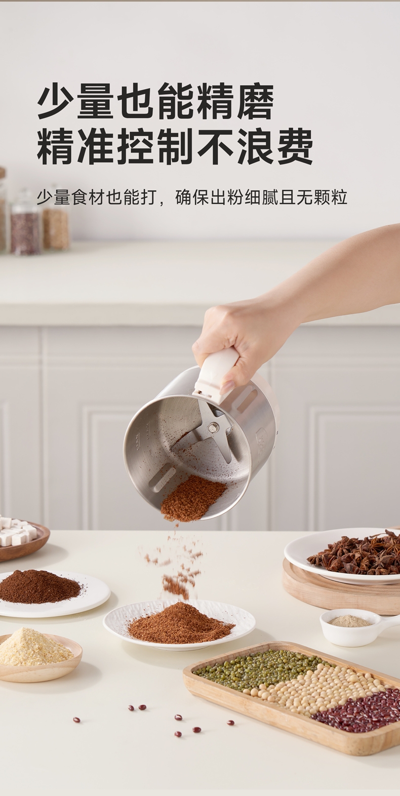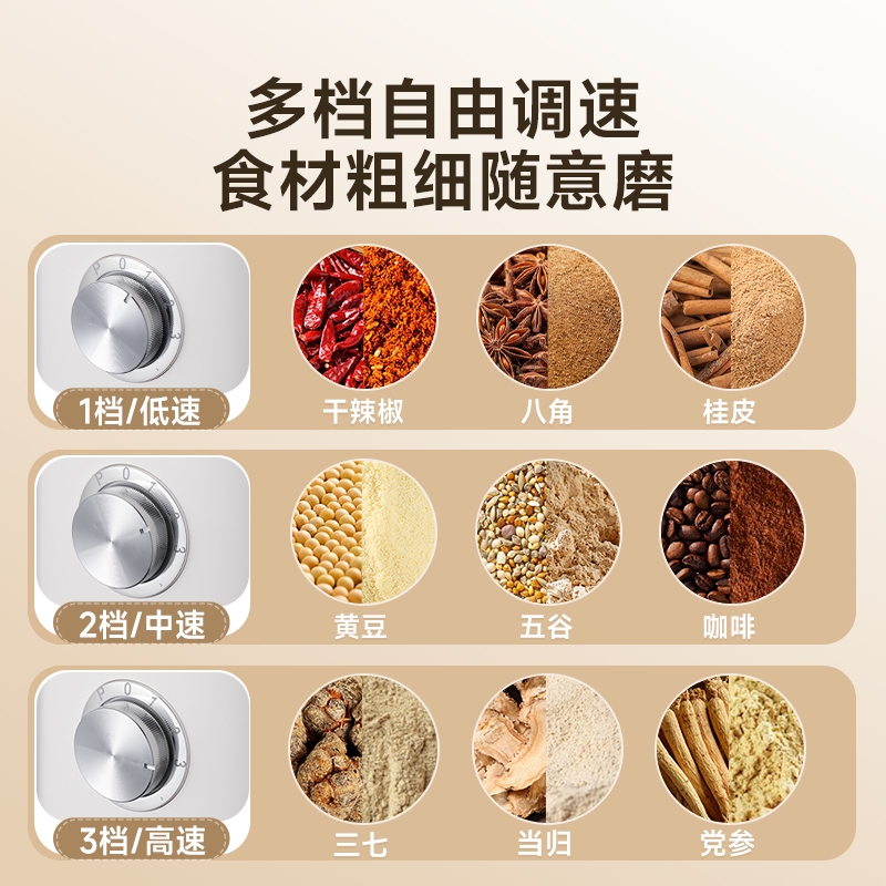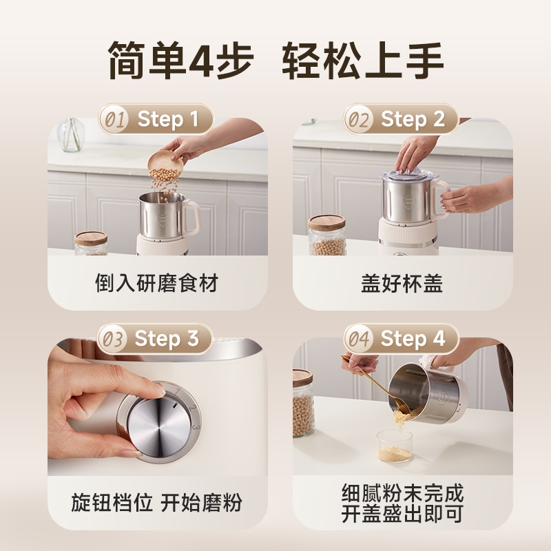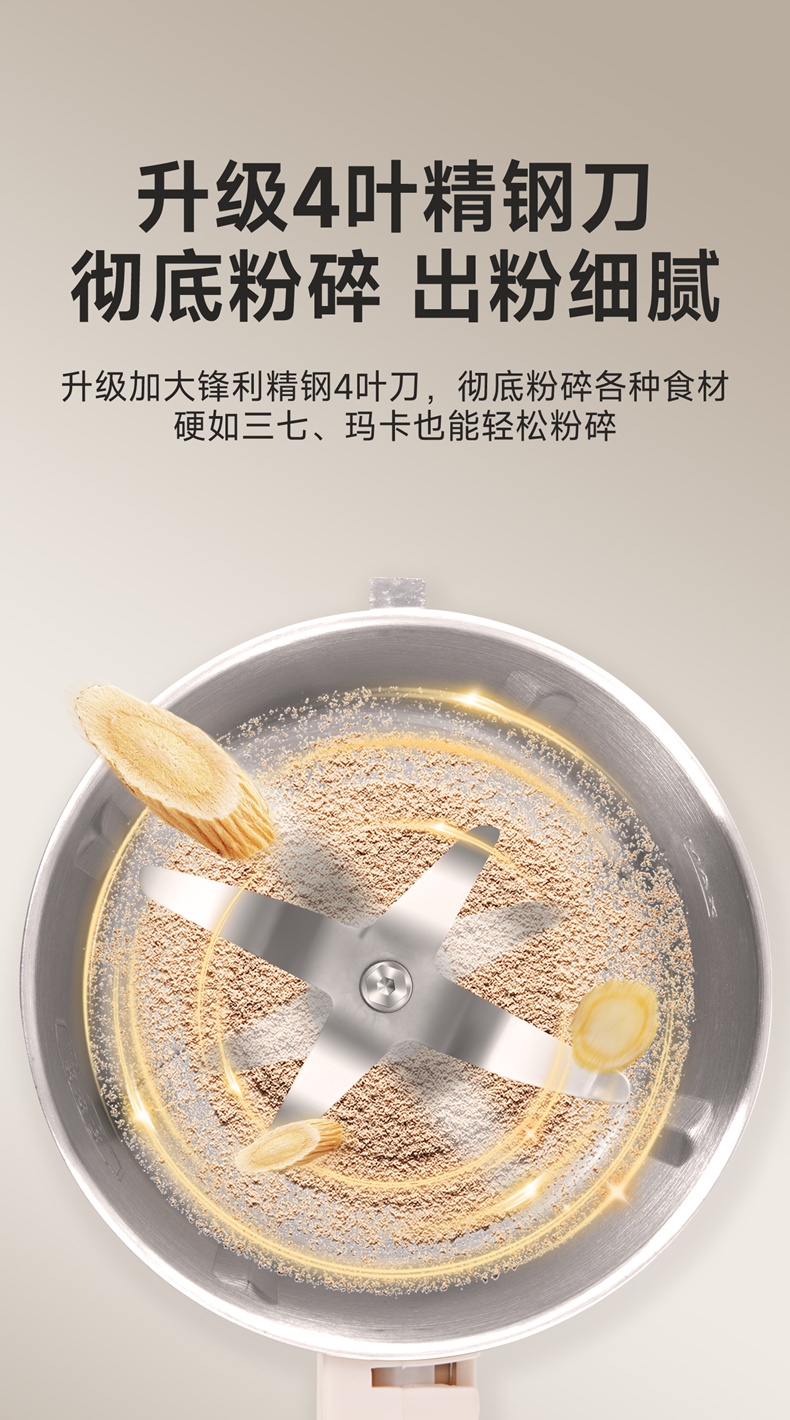 配置清单:500W大功率电机 高速精细研磨 800ml超大大容量 加大锋利精钢4叶精钢刀 出粉细腻 304不锈钢内胆 一体成型抗污防腐 少量也能精磨 精准控制不浪费 四档自由调速 食材粗细随意磨 主机与杯体分离设计 提拿倒料更方便 三重安装保护 细心体贴 家人放心