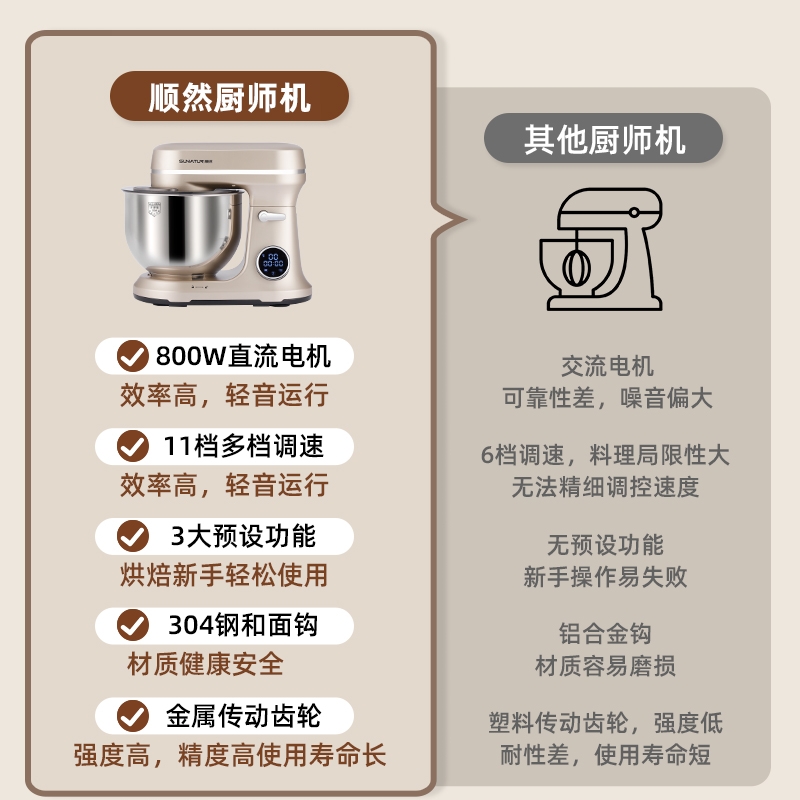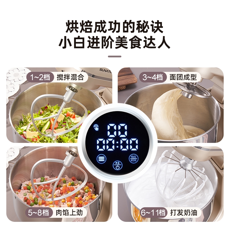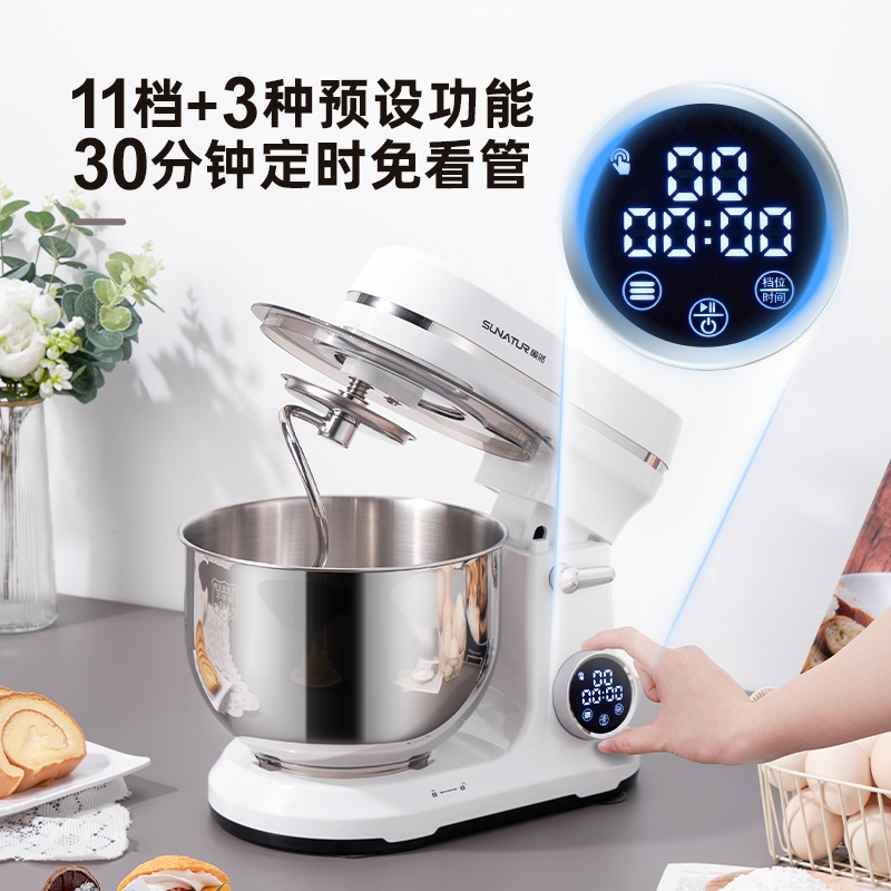 800w直流电机高效轻音运行,成团快,轻松出手套膜;11档精准调速,满足不同需求,30分钟定时免看管;3大预设功能,和面搅拌打发 金属传动齿轮高强度