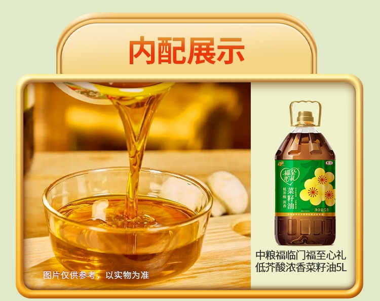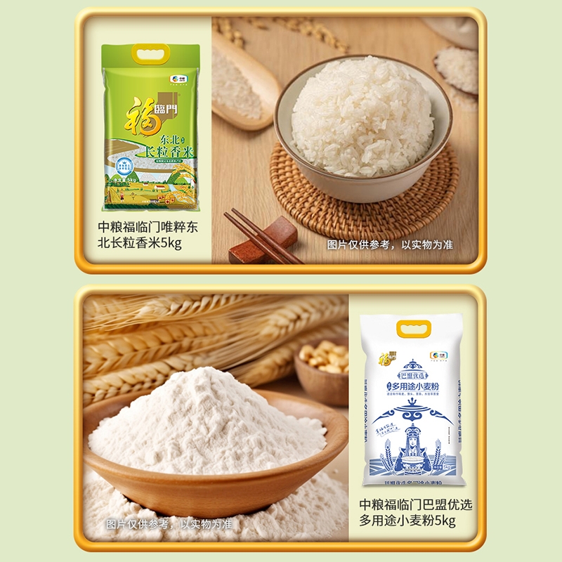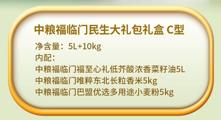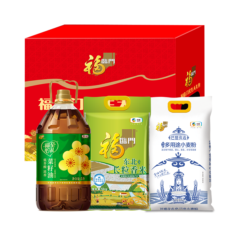 配置清单:净含量:10kg+5L 内配: 中粮福临门福至心礼低芥酸浓香菜籽油5L 中粮福临门巴盟优选多用途小麦粉5kg 中粮福临门唯粹东北长粒香米5kg
