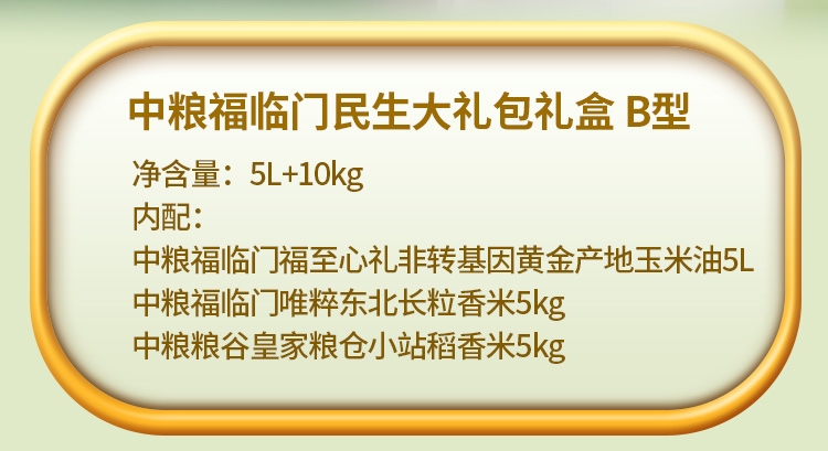 配置清单:净含量:10kg+5L 内配: 中粮福临门唯粹东北长粒香米5kg 中粮皇家粮仓小站稻香米5kg 中粮福临门福至心礼非转基因黄金产地玉米油5L