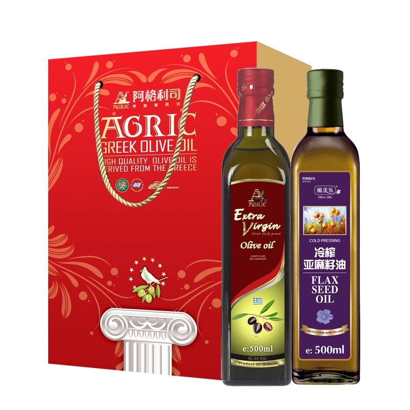配置清单:希腊特级初榨橄榄油500ml,+冷榨一级亚麻籽油500ml,礼盒*1