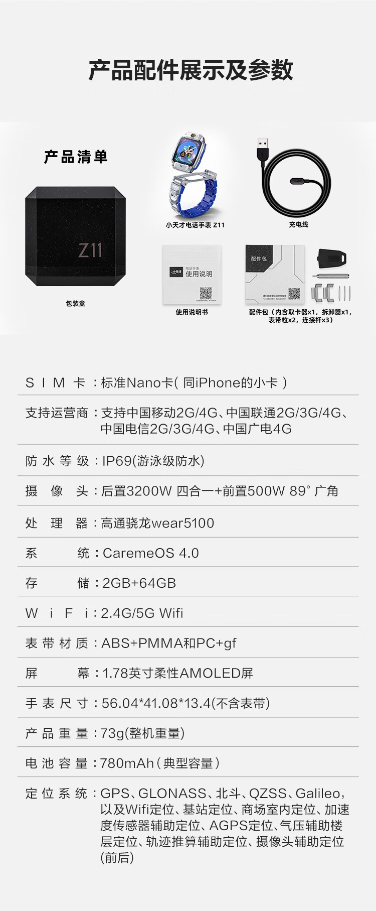 清单:手表×1、包装盒×1、充电座连接线×1、取卡器×1、可拆卸表带(大小各一粒)、表带拆卸器、表带连接杆、说明书、保修卡