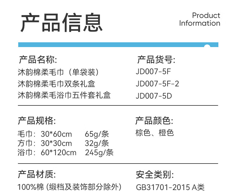 配置清单:毛巾:30*60cm*2 65g*2条 方巾:30*30cm*2 32g*2条 浴巾:60*120cm*1 245g*1条