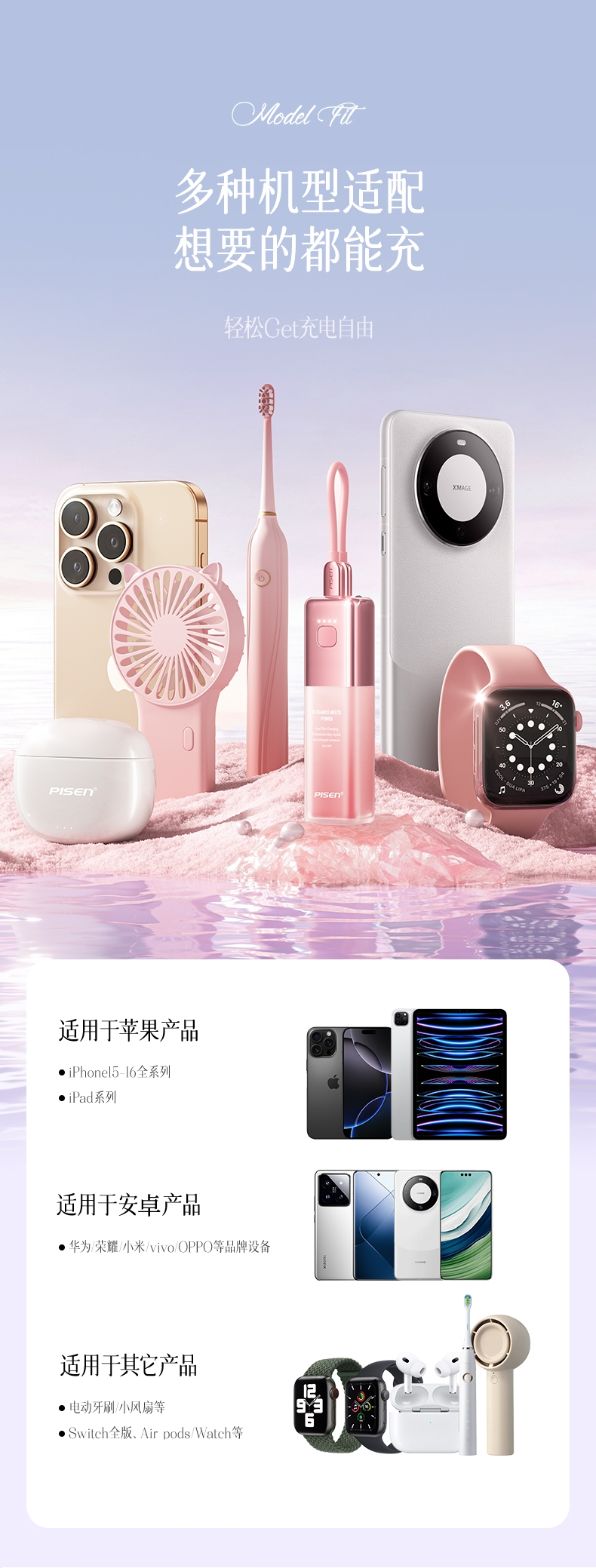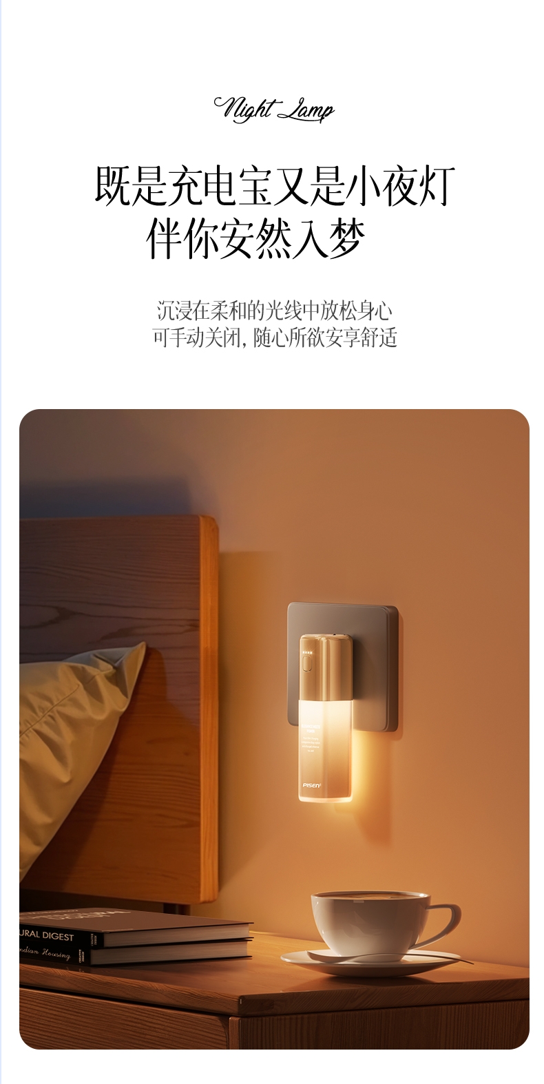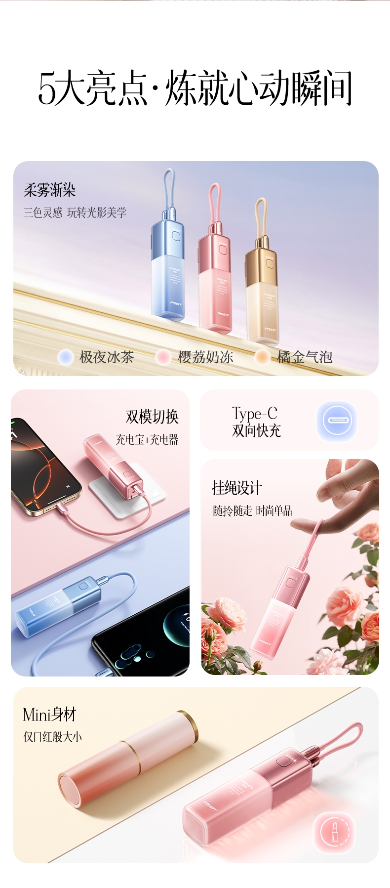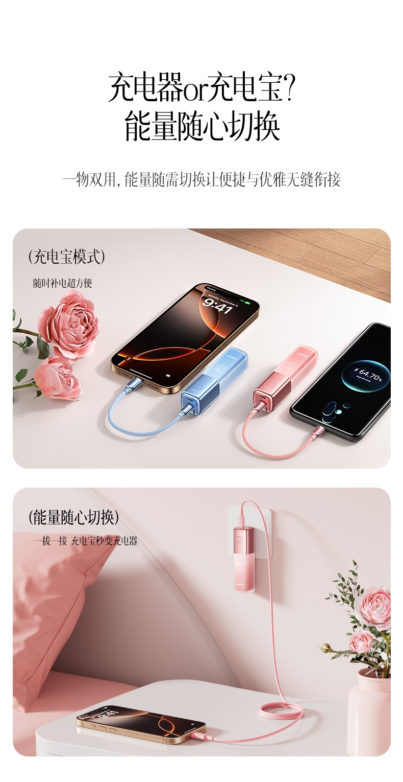 充电器+充电宝+自带线多功能合一,一机双用;柔雾渐染,炫彩时尚;折叠插脚,收纳更方便