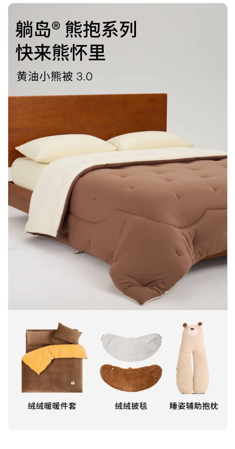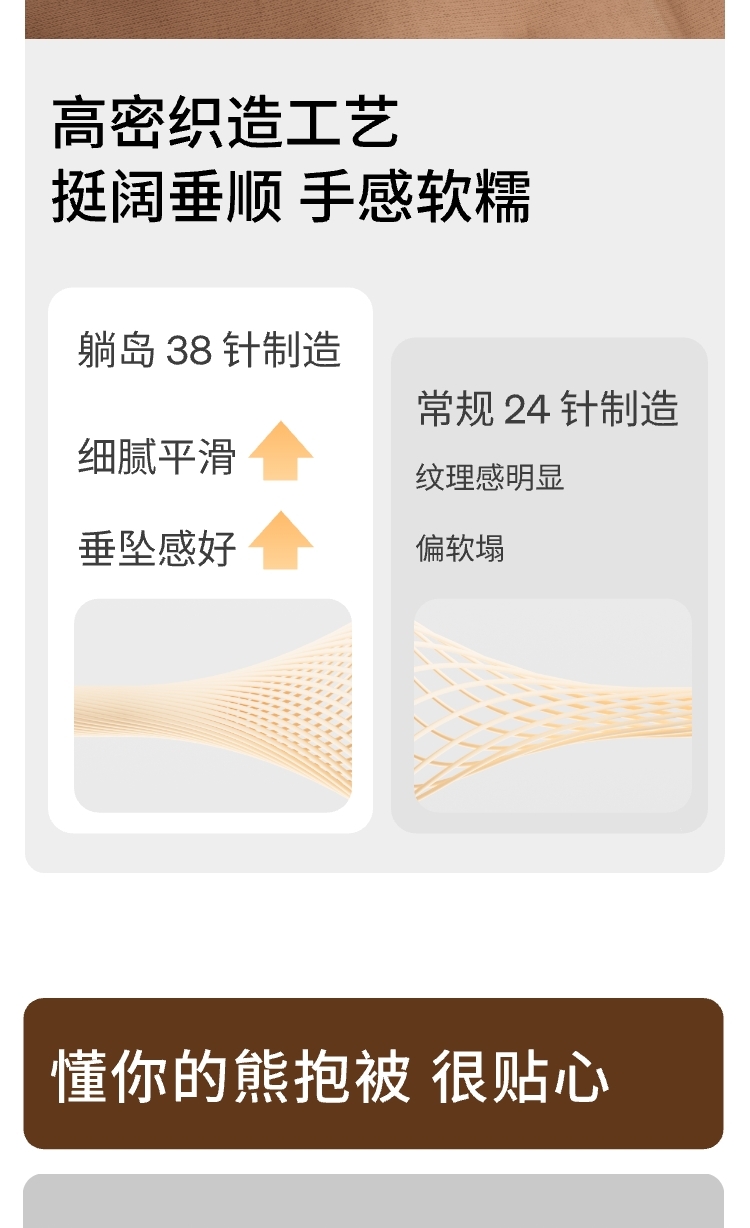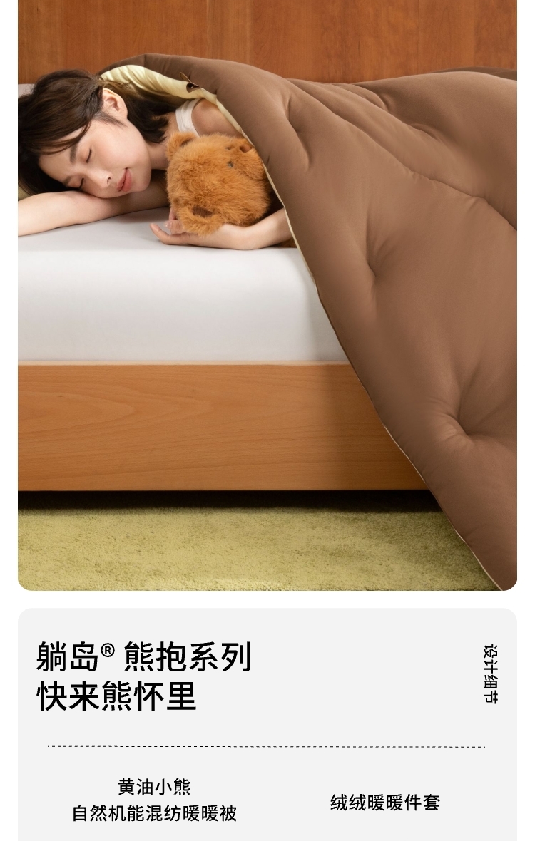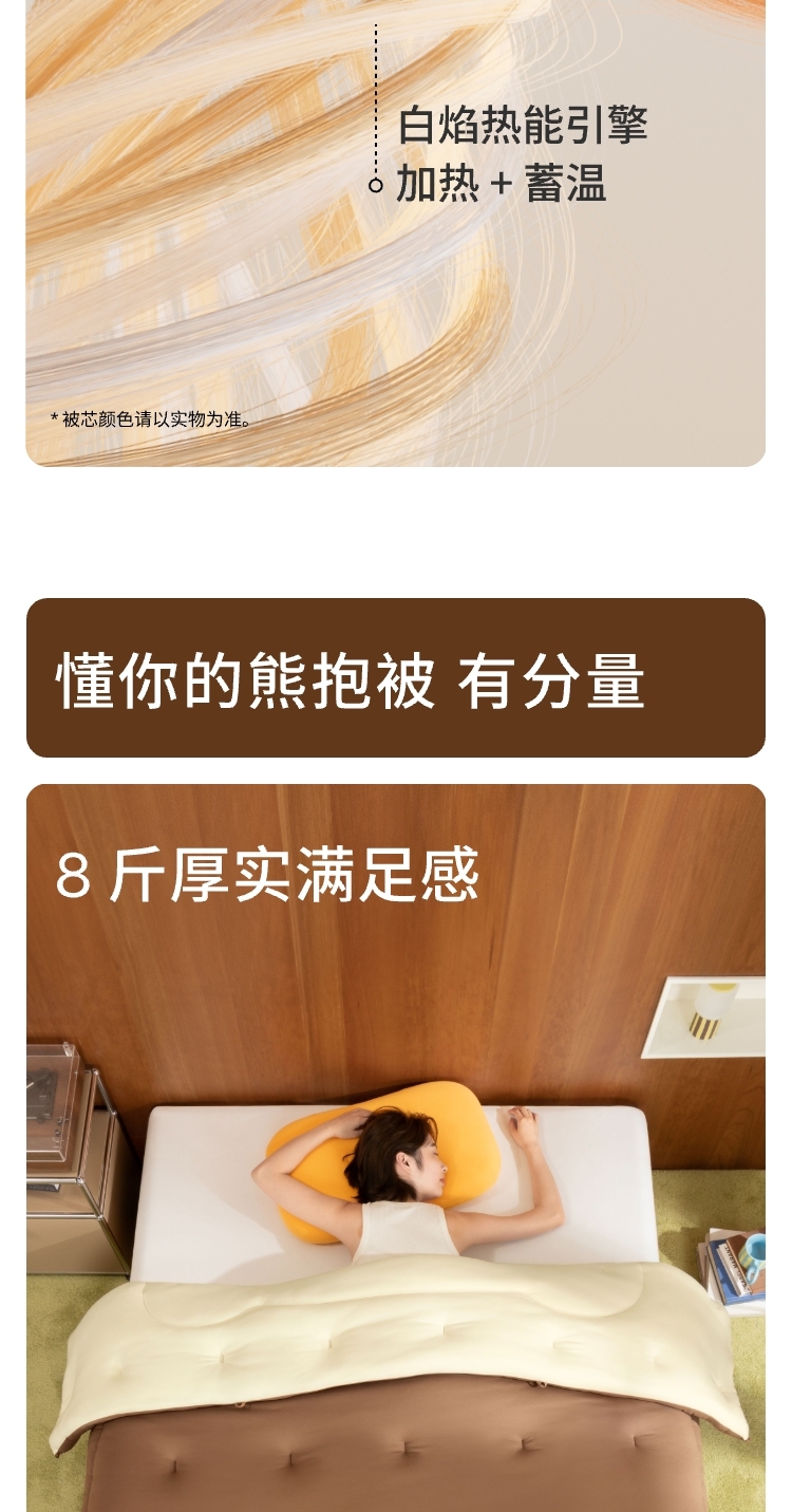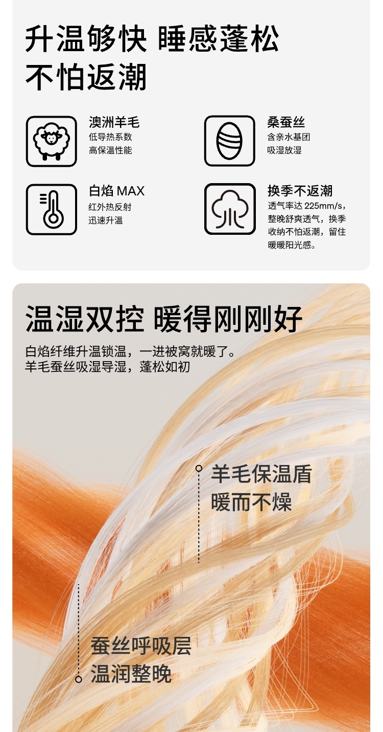 六大维度睡眠系统,涵盖温度;白焰纤维(78%)科技发热+羊毛(11%)自然调湿;恰如熊的微重力拥抱,内衣级别密针织遗