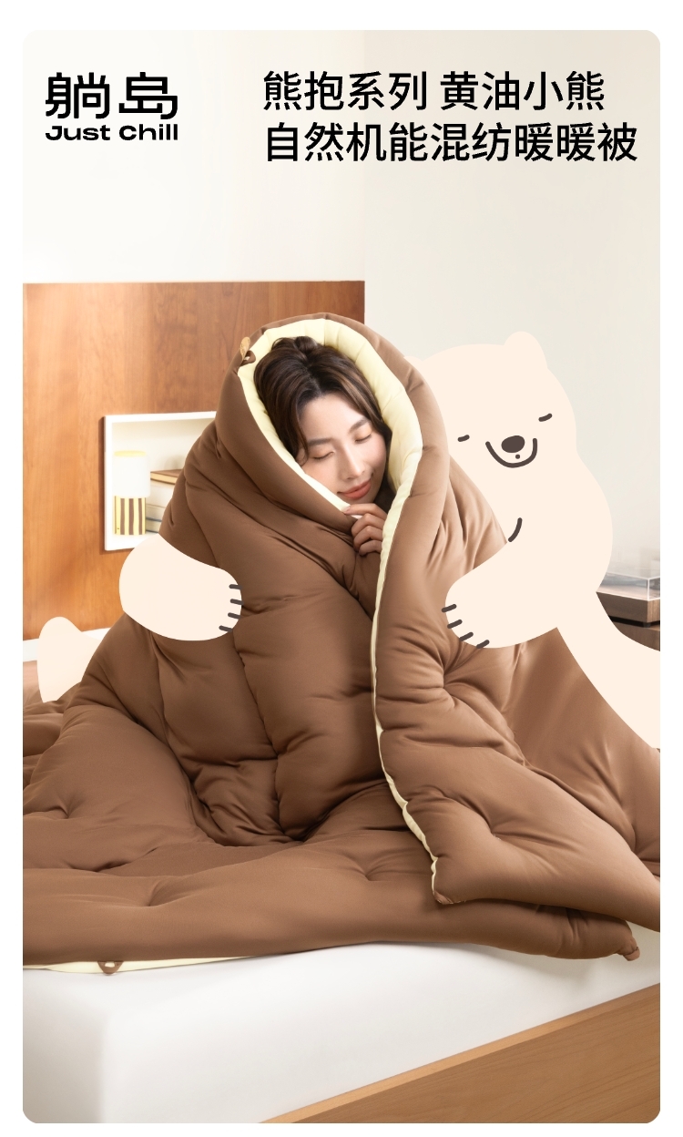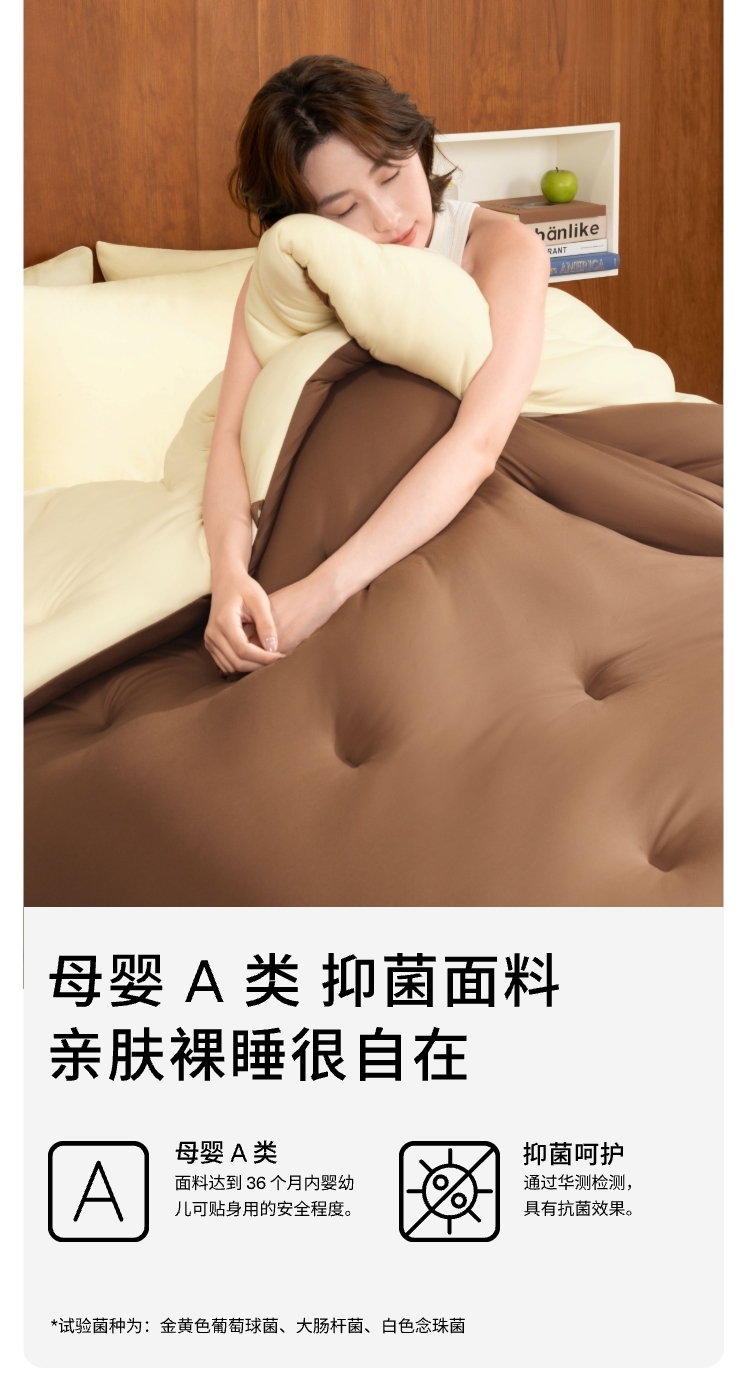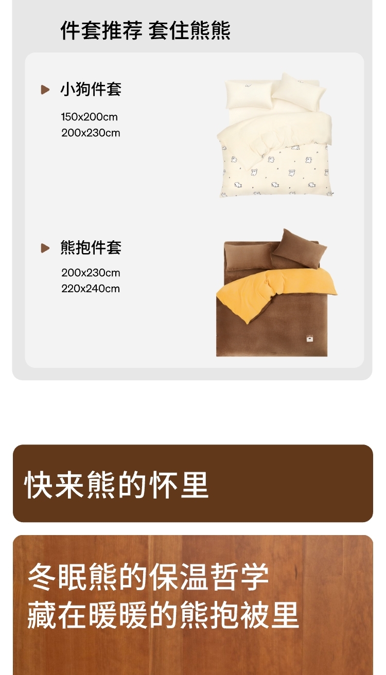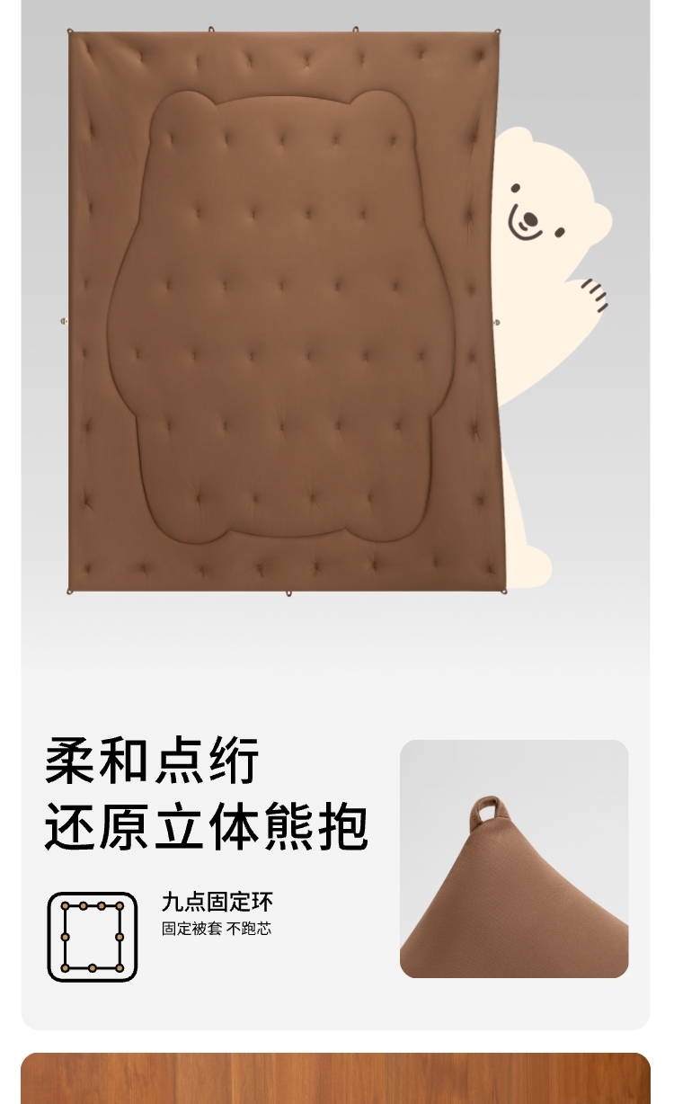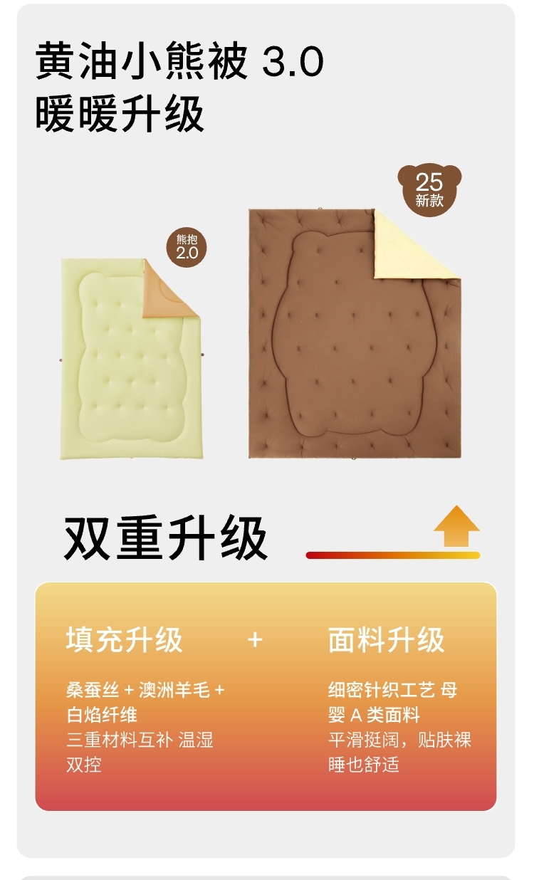 六大维度睡眠系统,涵盖温度;白焰纤维(78%)科技发热+羊毛(11%)自然调湿;恰如熊的微重力拥抱,内衣级别密针织遗