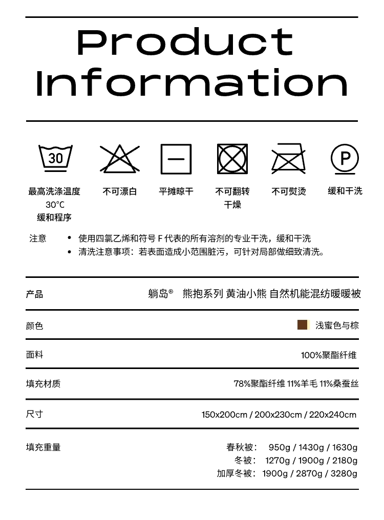 填充:78%聚酯纤维11%羊毛11%桑蚕丝