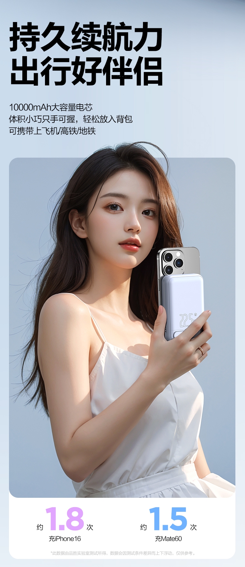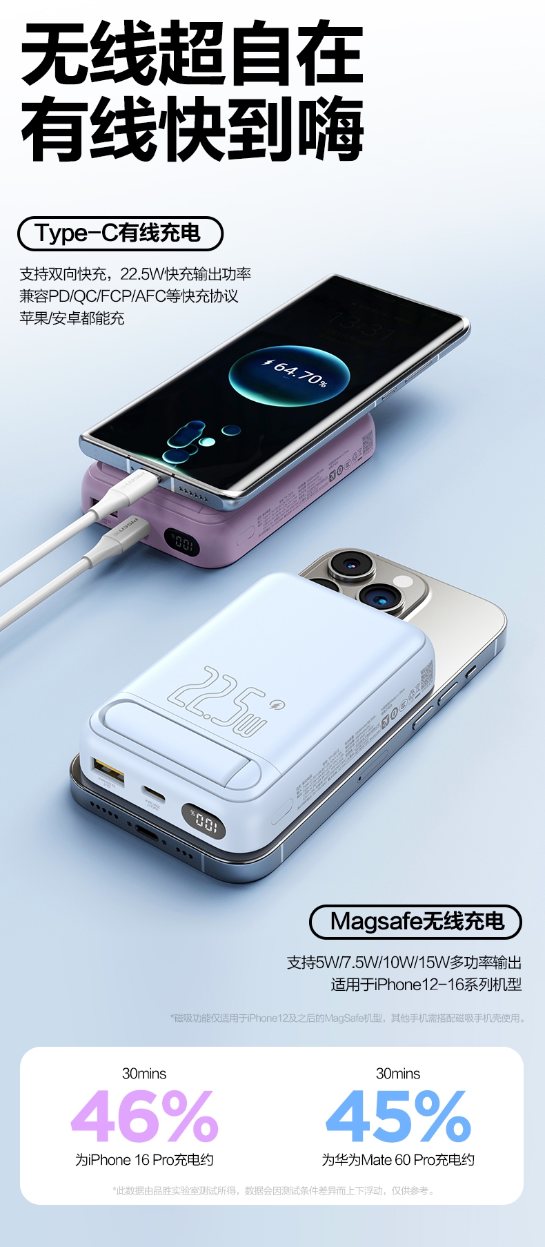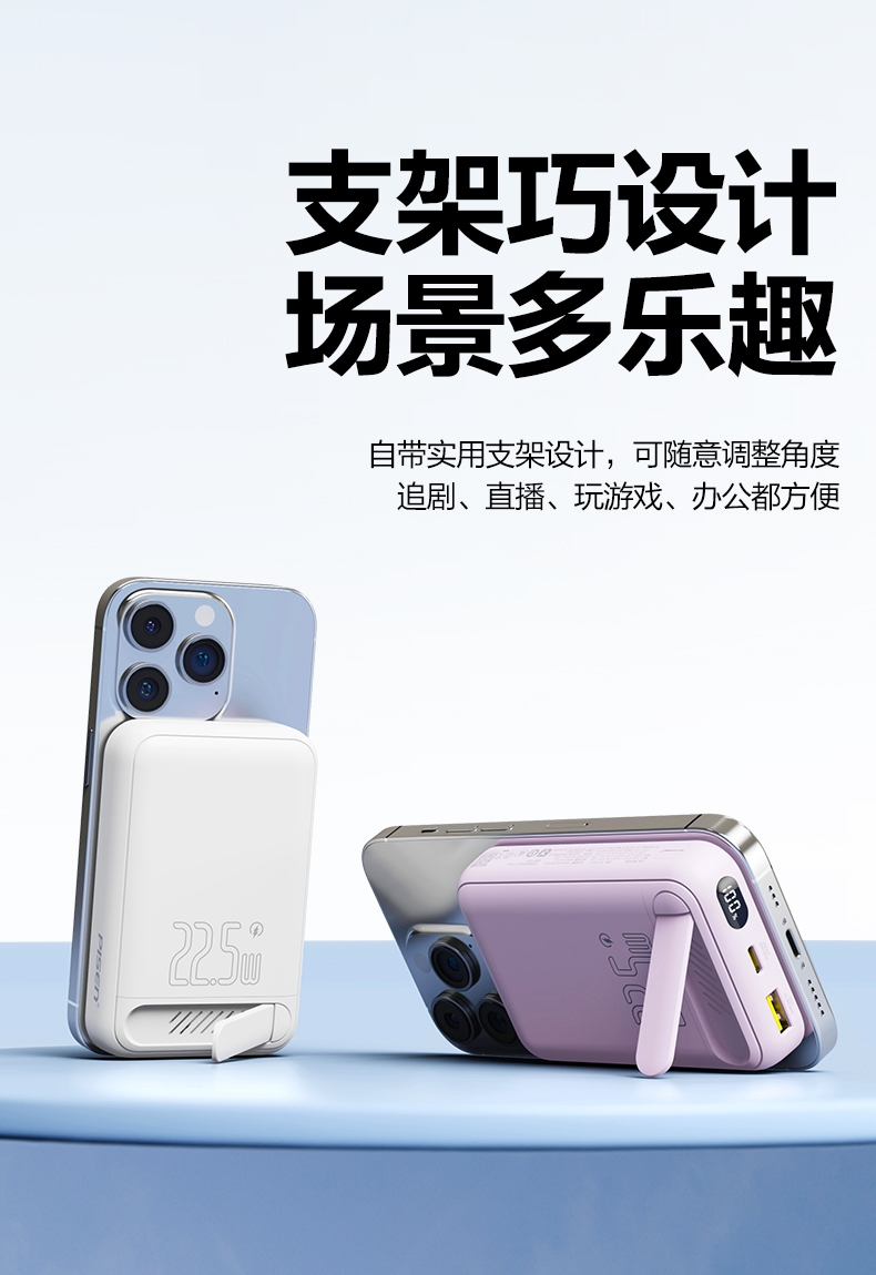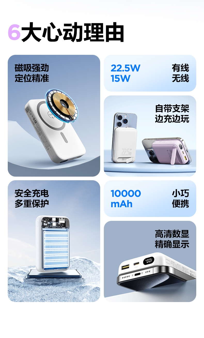 无线磁吸,超强磁吸不脱落,自动精准配对;支持LED屏显,实时显示剩余电量,随心掌控;折叠支架设计,横竖皆可,畅享解放双手;支持多协议快充,最高支持22.5W快充,安全快速;10000mAh高密度聚合物电芯,足额实标